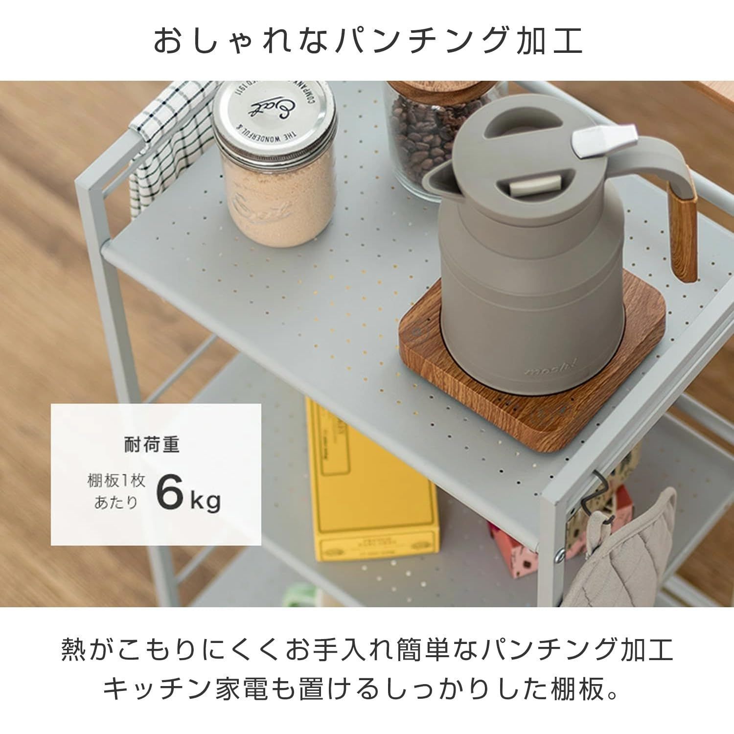 本体:スチール(紛体塗装)/棚板はパンチング(多孔)加工がされており通気性が良く、お手入れが簡単にできます。