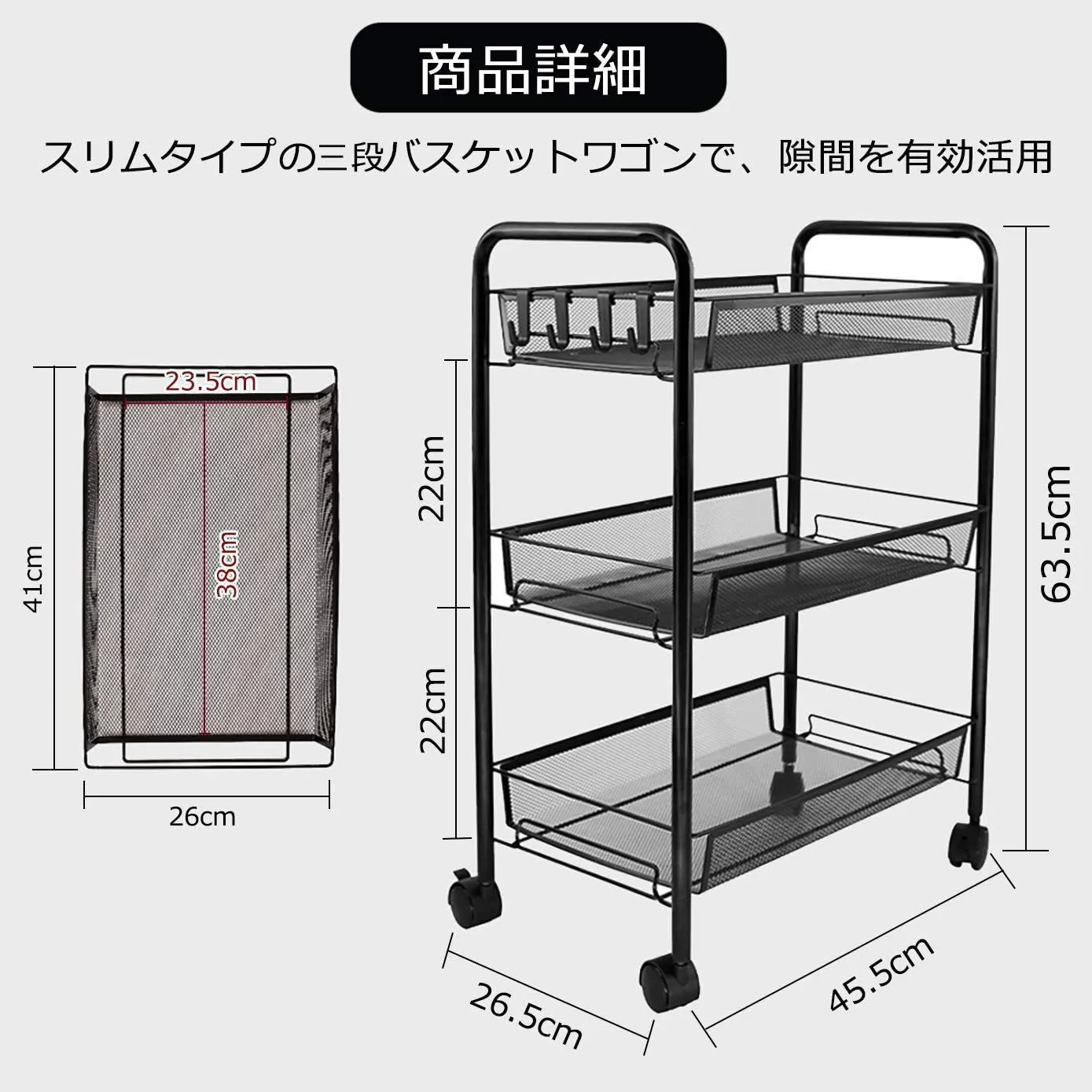 【商品詳細】★本体サイズ:幅26.5×奥行45.5×高さ63.5cm 重量(約):2.35Kg ★耐荷重(約):45kg(一つあたり15kg)★バスケット間口:幅26 奥行41cm ★バスケット内寸:幅23.5 奥行38 高さ6cm