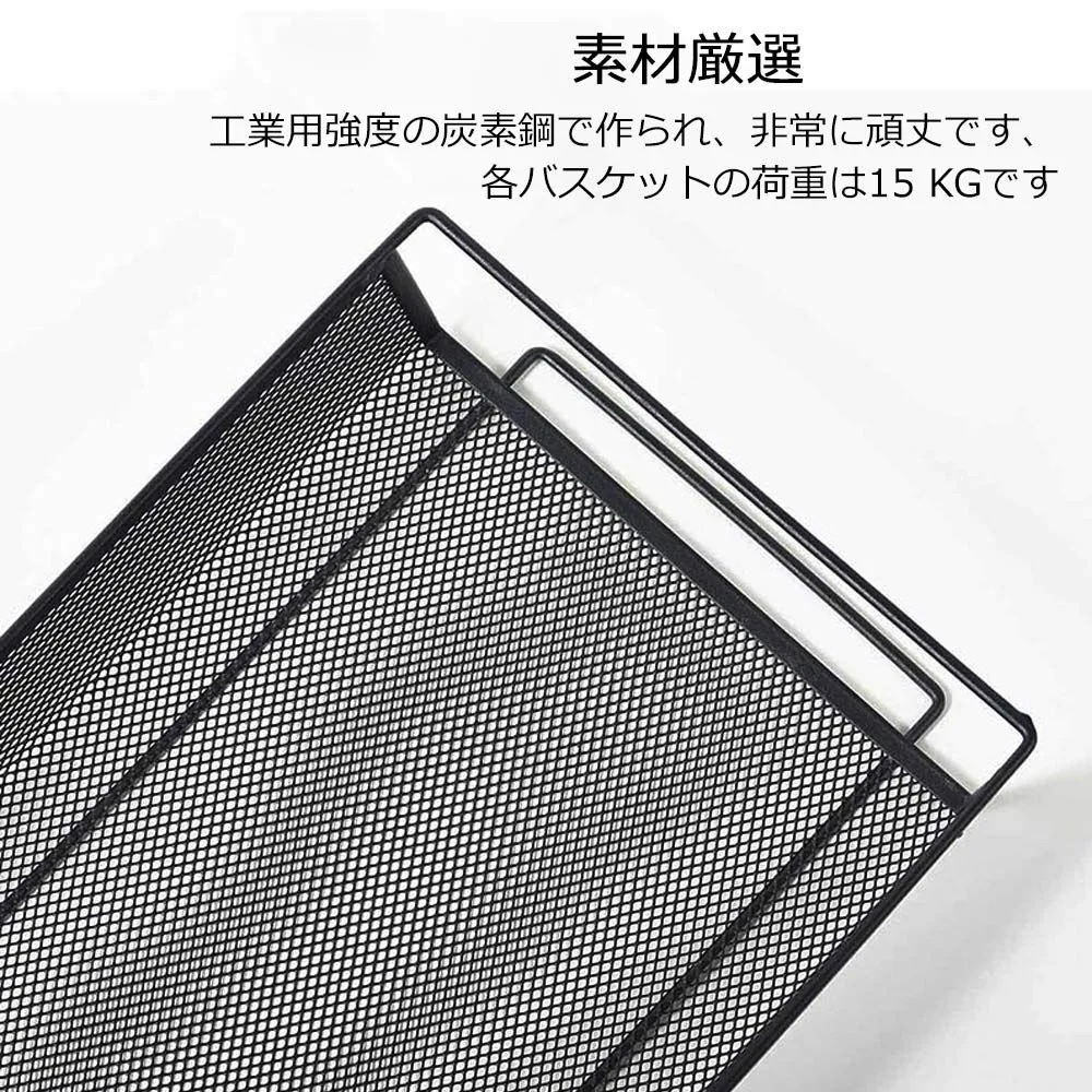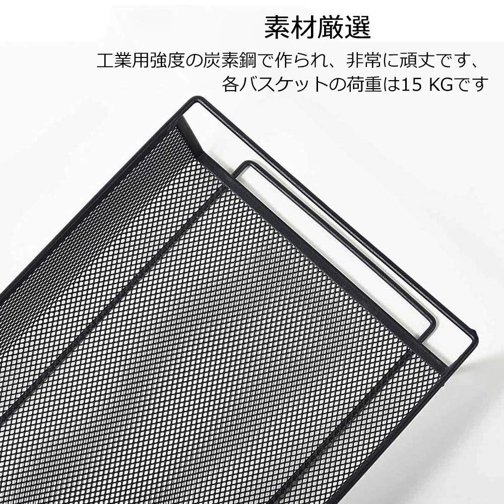【軽くて丈夫なスチール製の3段のラック】工業用強度の炭素鋼で作られ、非常に頑丈です。カゴのメッシュが細かくて物を載せやすくしています。またトレーを外すことができ、掃除もしやすくなります。中身が見えますので、探しやすく通気性も良くて便利です。 商品の寸法 26.5奥行き x 45.5幅 x 63.5高さ cm 棚のタイプ 階層型シェルフ 材質 鉄 フレームの素材 炭素鋼 ブランド EKNITEY 最後までご確認頂き誠にありがとうございました。 上記をご確認頂き、ご購入いただけましたら幸いです。 何かご不明な点がございましたらお気軽にメッセージからお問い合わせ下さい。