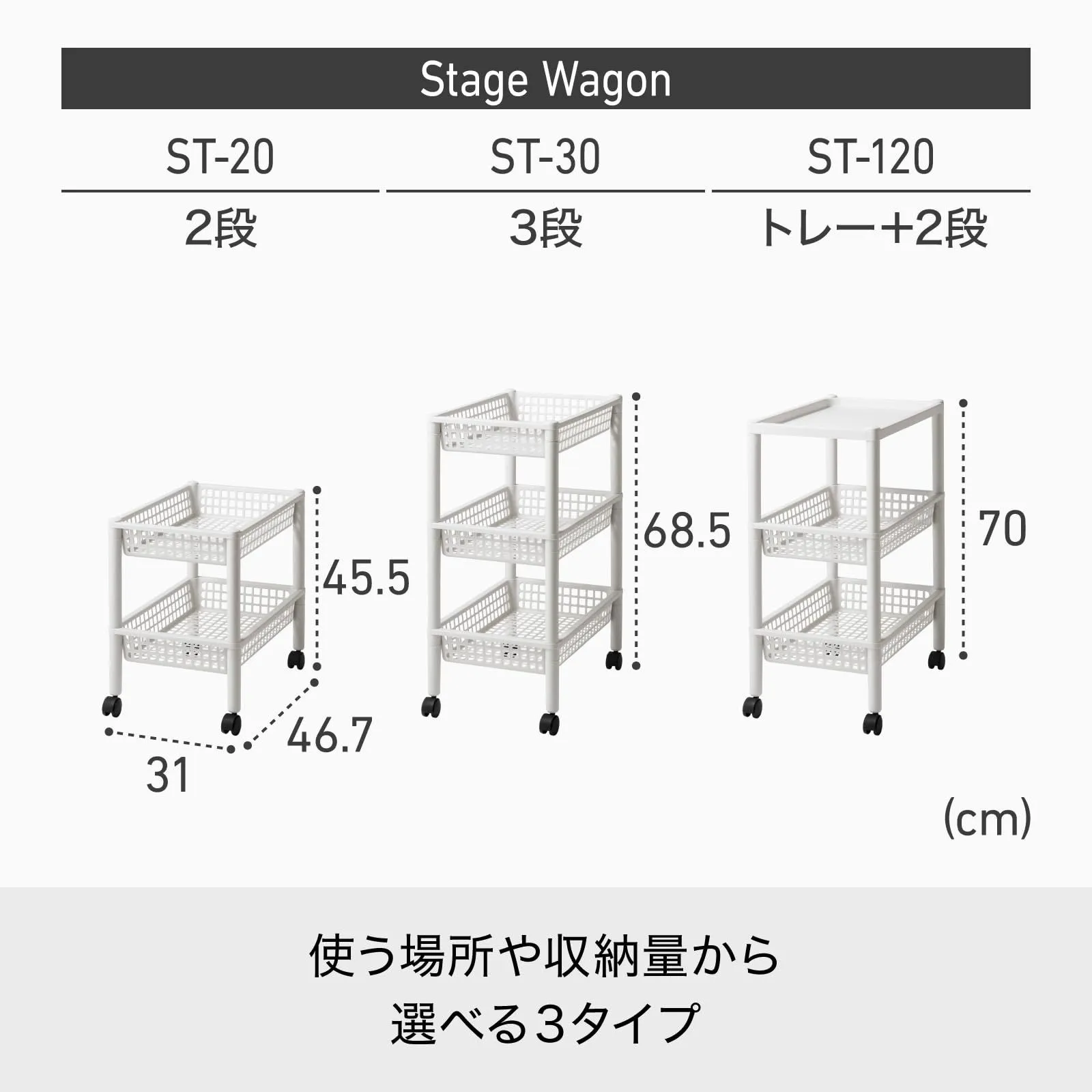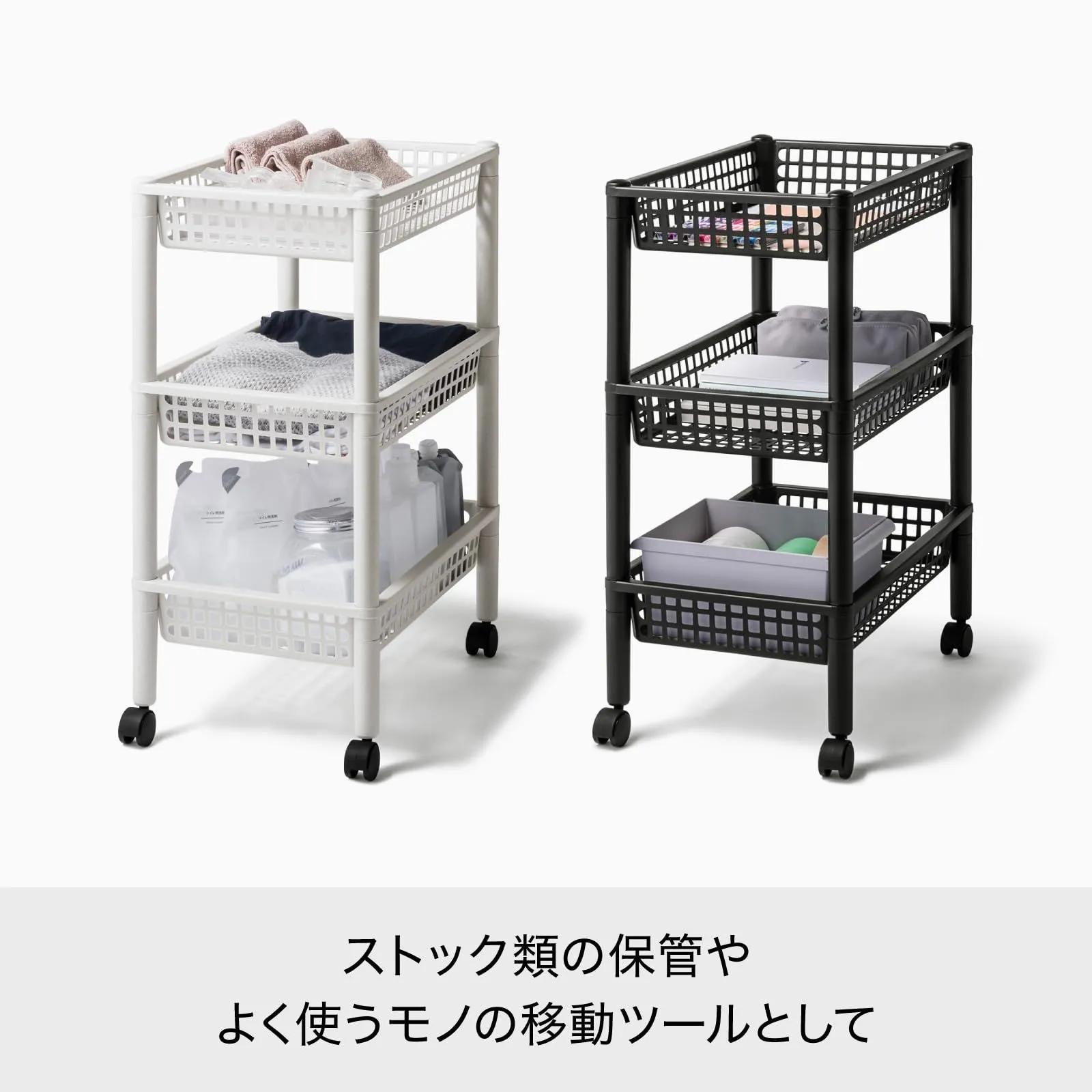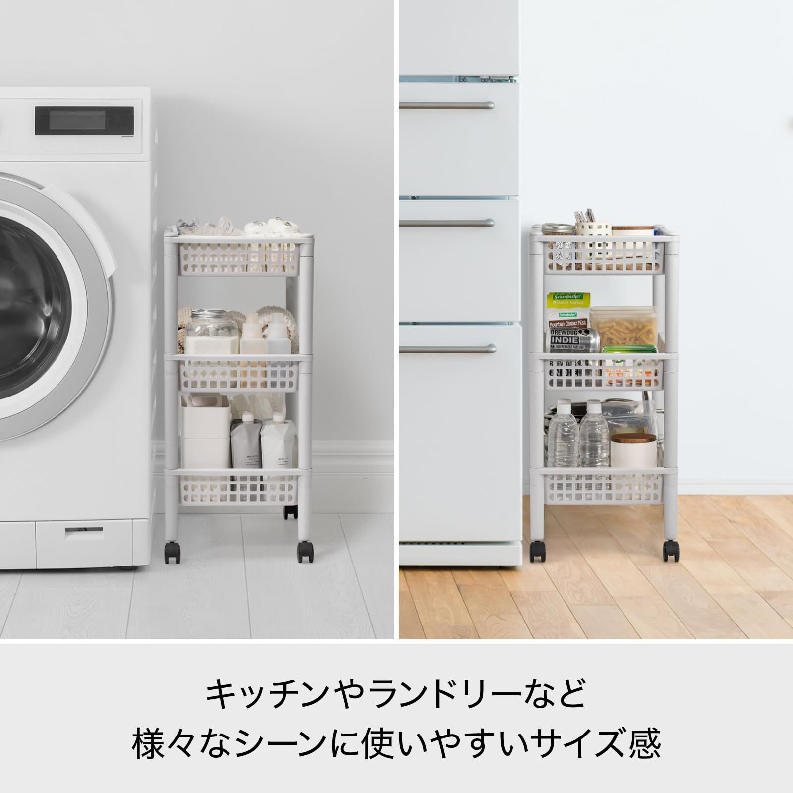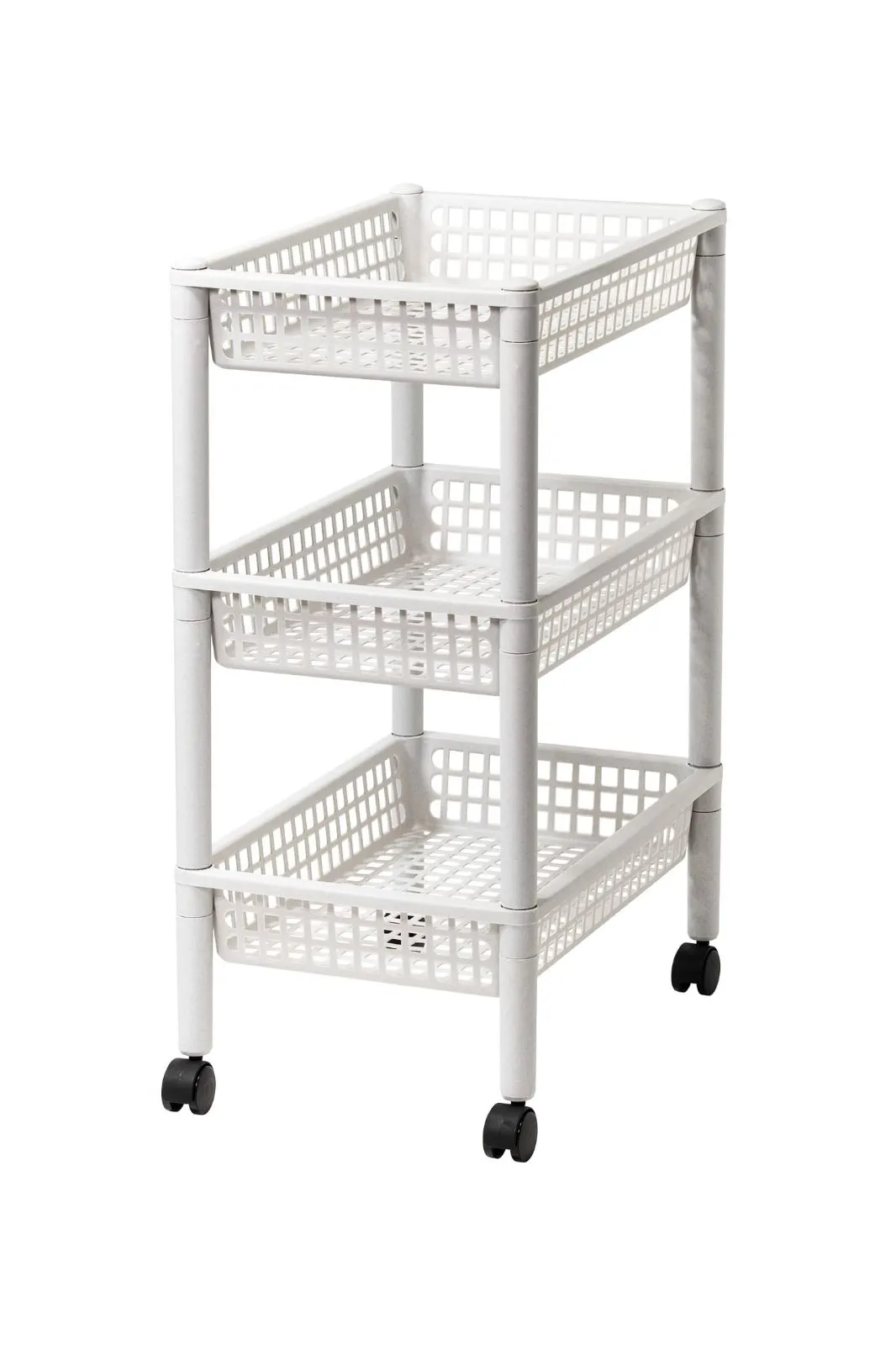 浅型バスケット3段タイプのワゴン。 浅型のバスケットなので小物も見やすくスッキリ収納。 キッチンで小物の収納や食品のストック、サニタリーでの小物収納など多目的に使える収納ワゴン。 掃除の際などに簡単に移動できるキャスター付き。 より