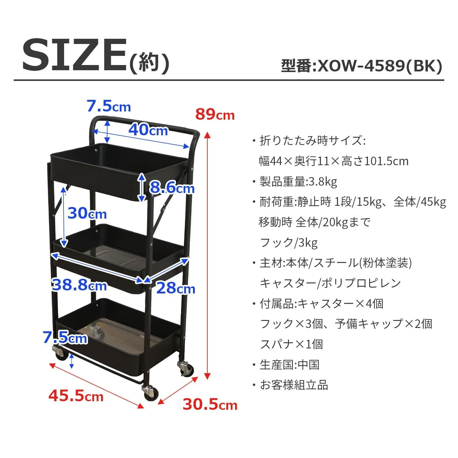 商品重量(約):3.8kg、耐荷重(約):静止時1段/15kg、全体/45kg、移動時 全体/20kg