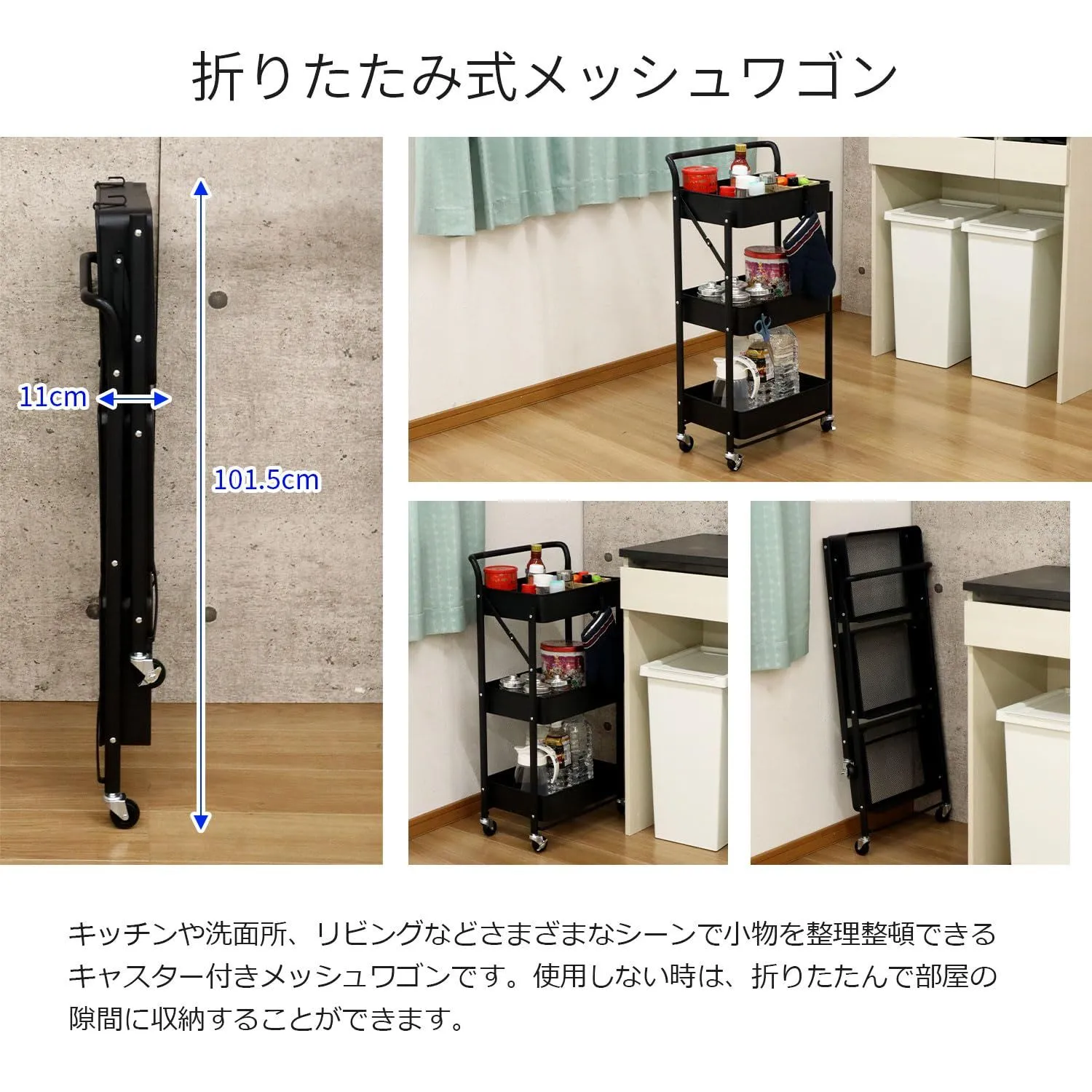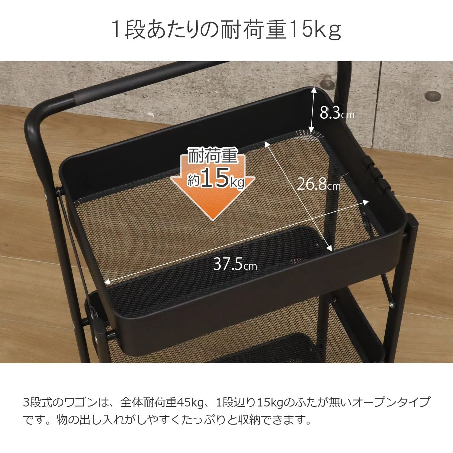 ◆ ・収納にとても便利なキャスター付きワゴン。使わない時は、折りたたんで部屋の隙間に収納することができます。 ・通気性の良いメッシュ仕様の底板はホコリがたまりにくく、湿気もこもりにくいのでお手入れも簡単です。 ・3段式のワゴンは、全体耐荷重45kg、1段辺り15kgのふたが無いオープンタイプです。物の出し入れがしやすくたっぷりと収納できます。 ・箱から出した本体を開いてキャスターを取付けるだけの簡単組立。 ・キャスターは、360度回転可能、スムースに移動できます。キャスター4個のうち2個はストッパー付きなのでワゴンを固定する時も安心です。 ・小物や袋などをかけるフックが3個と予備キャップが2個付属しております。