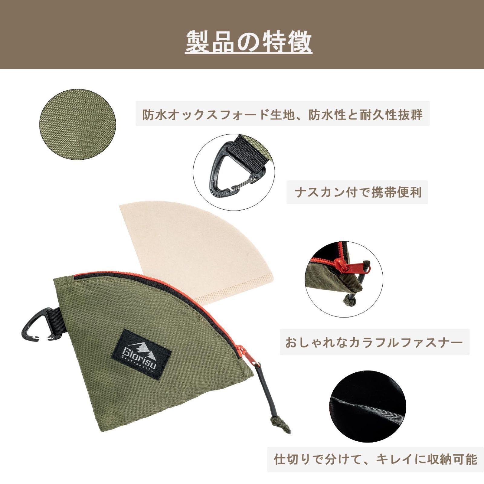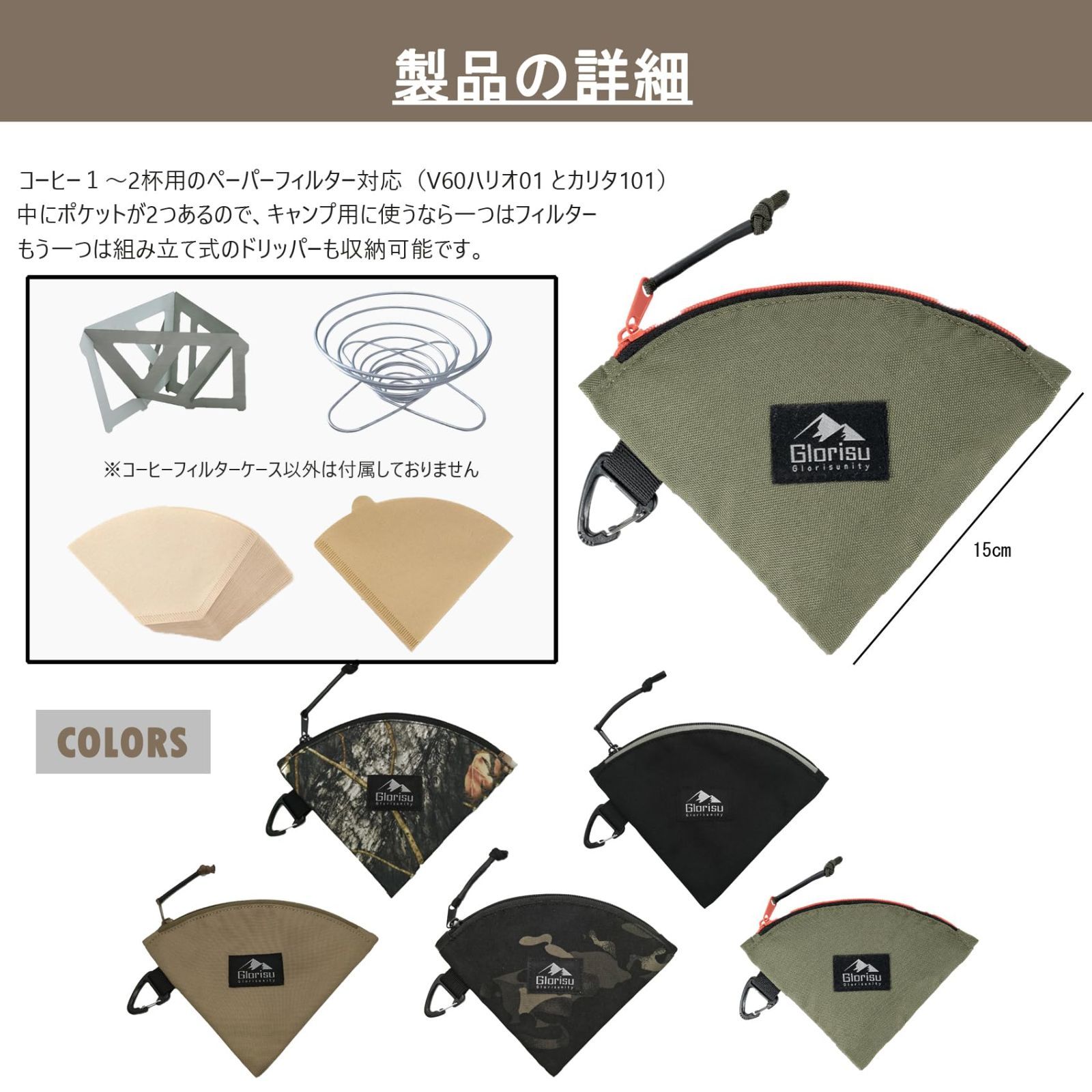 【サイズ】:開口部20CM 防湿気・防塵です。外でコーヒーを淹れる時、湿気と埃で、フィルターを保護する必要があります。 携帯性が抜群、カッコ良いケースです。アウトドア、キャンプコーヒーに欠かせないもの。 頑丈なカラビナで、アウトドア時カバンに掛けたり、枝、ランタンスタンドなどに掛けてもケースの開け閉めに影響しません。家で使ったら壁付フックに掛けても問題ありません。 材質 ナイロン ブランド Glorisunity 形状 コーン 個数 1 ユニット数 1.00 個 最後までご確認頂き誠にありがとうございました。 上記をご確認頂き、ご購入いただけましたら幸いです。 何かご不明な点がございましたらお気軽にメッセージからお問い合わせ下さい。
