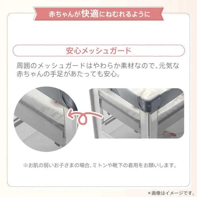 ■商品説明(製品の特徴) 快適にねむれて、コンパクトに折りたためる構造でありながら、PSC・SGマークを取得した安心・安全なベビーベッドです。 エアープラスでは、マットが取り外して洗濯機で丸洗い可能。