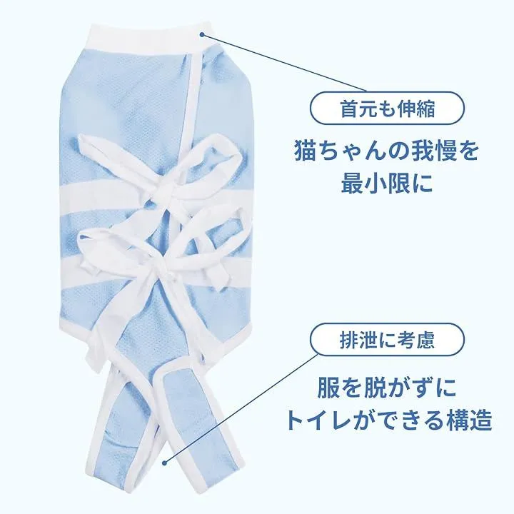 ストレスの元となるエリザベスカラーから卒業。 柔らかな着心地が愛猫の自由な動きを妨げず、術後のデリケートな時期をいつも通り快適に過ごせるようにしてくれる術後ウェアです。