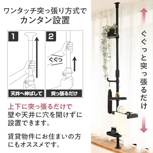 【カンタン設置】実用新案取得済みのワンタッチ突っ張り方式で、上下に突っ張るだけでカンタンに設置が可能です。壁や天井に穴を開けずに設置できるので、賃貸物件にお住まいの方にもおすすめです。
