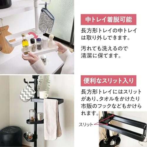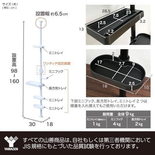 【マグネット使用可能】フックが1つ、トレイが4つ付属しています。フックとトレイは付属のゴムリングでカンタンに高さ調節できます。 本体サイズ(約):幅18奥行30高さ98-160cm耐荷重 : 全体耐荷重9kg(ミニトレイ1個あたり : 約1kg、ミニフック : 約4kg、長方形トレイ : 約2kg)構造部材 :スチールパイプ、ゴム、ポリプロピレン、ABS樹脂、熱可塑性エラストマー表面加工 : エポキシ樹脂塗装東証プライム(株)山善で扱うすべての山善商品は、自社もしくは第三者機関において、JIS規格に基づいた品質試験を行っております。