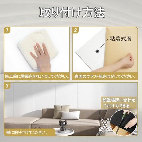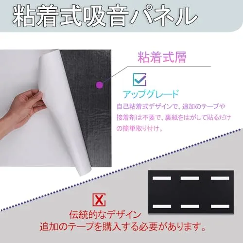 【設置簡単】自己粘着式デザインで、追加のテープや接着剤は不要で、裏面のクラフト紙をはがして貼るだけの簡単施工。設置面が清潔で乾燥していれば、誰でも手軽に取り付け可能な防音パネルです。