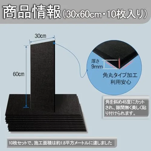 【商品詳細】サイズ:(約)幅30cm長さ60cm厚さ0.9cm ※1枚あたり、重量:(約)230g ※1枚あたり、全10枚入り、材質:高密度吸音ポリエステル繊維、施工面積:約1.8平方メートル。自己粘着で到着後すぐ利用可能、角を斜め45度にカットされ、隙間無く美しく貼り付けられます。