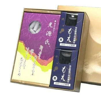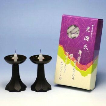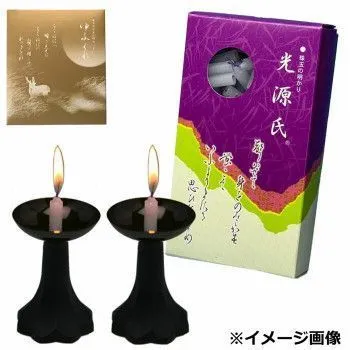 ロウが残らない特許燭台「もえ」2個と超短寸ローソク「光源氏」をセットしたご進物です。