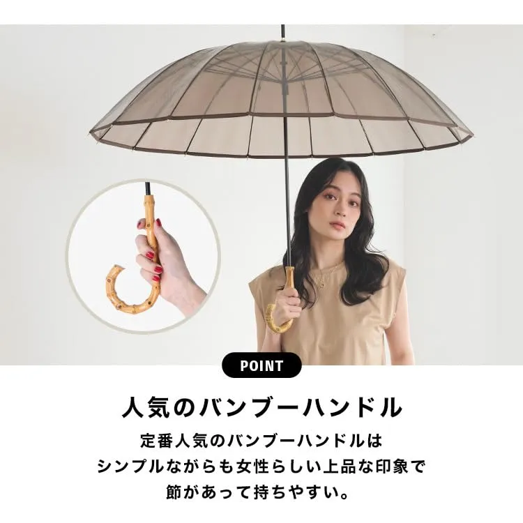 大人気!風に強い16本骨のおしゃれなビニール傘。 節があって持ちやすいバンブーハンドルは、シンプルながらも女性らしい上品な印象を演出します。