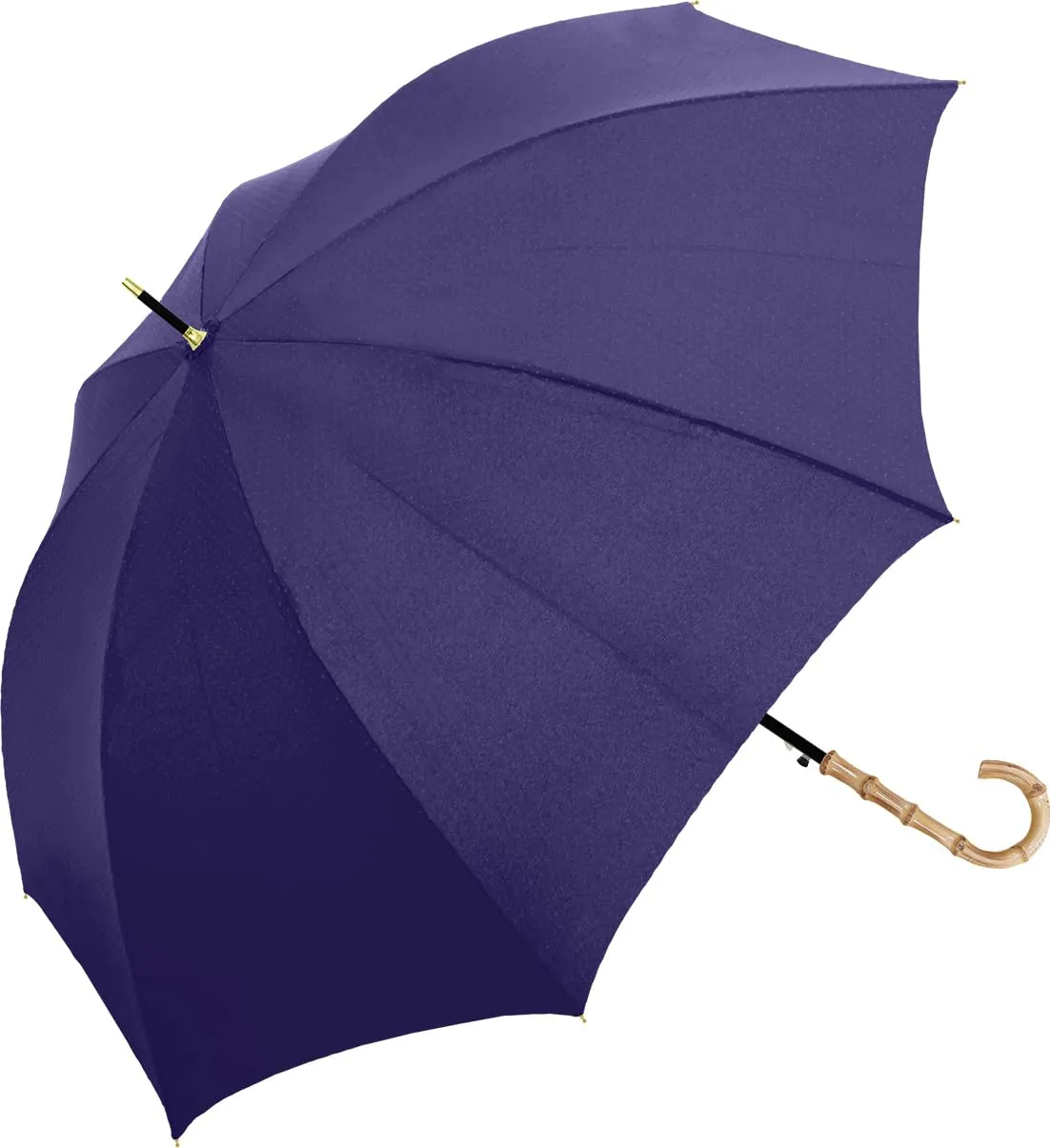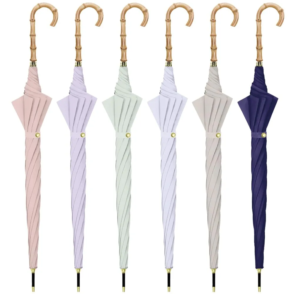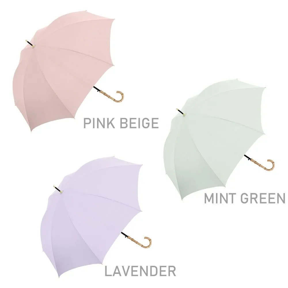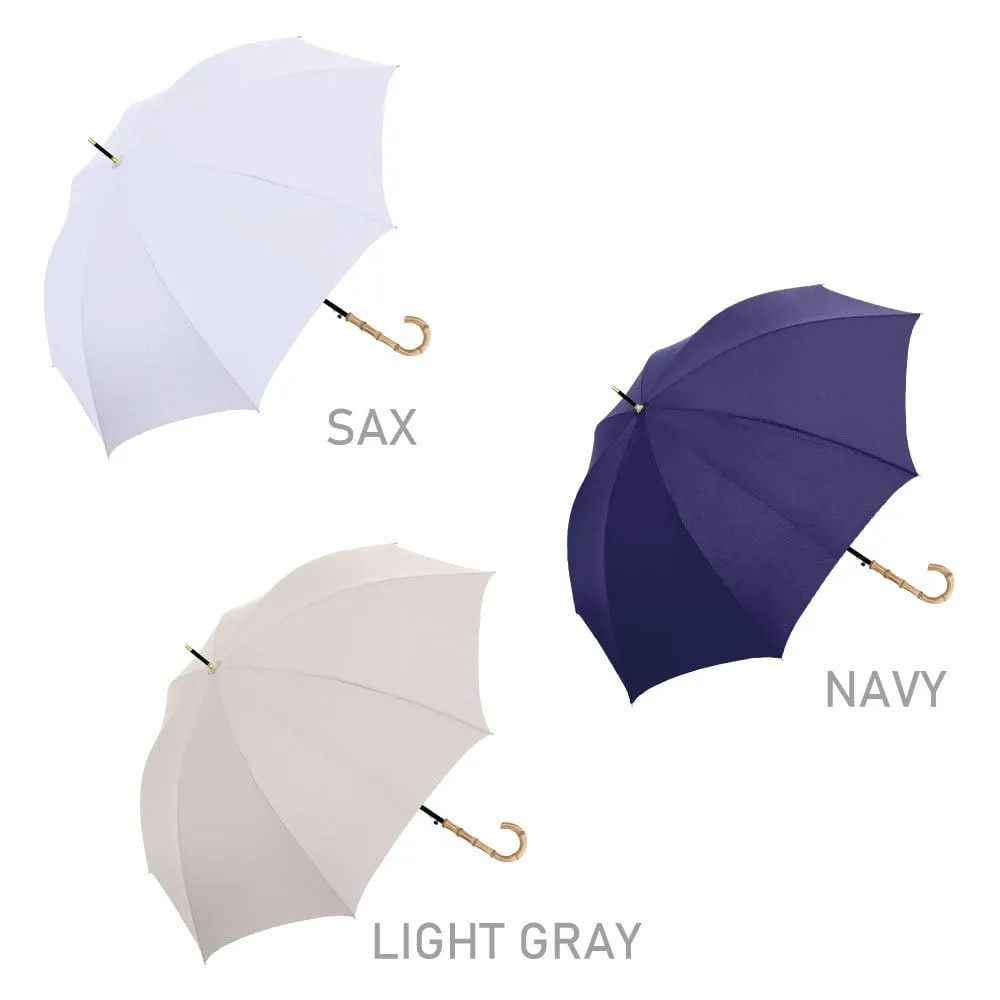 バンブー手元の無地傘です。ニュアンスカラーから定番カラーまで取り揃えました。親骨は、風に強くしなやかで折れにくいグラスファイバー骨仕様です。