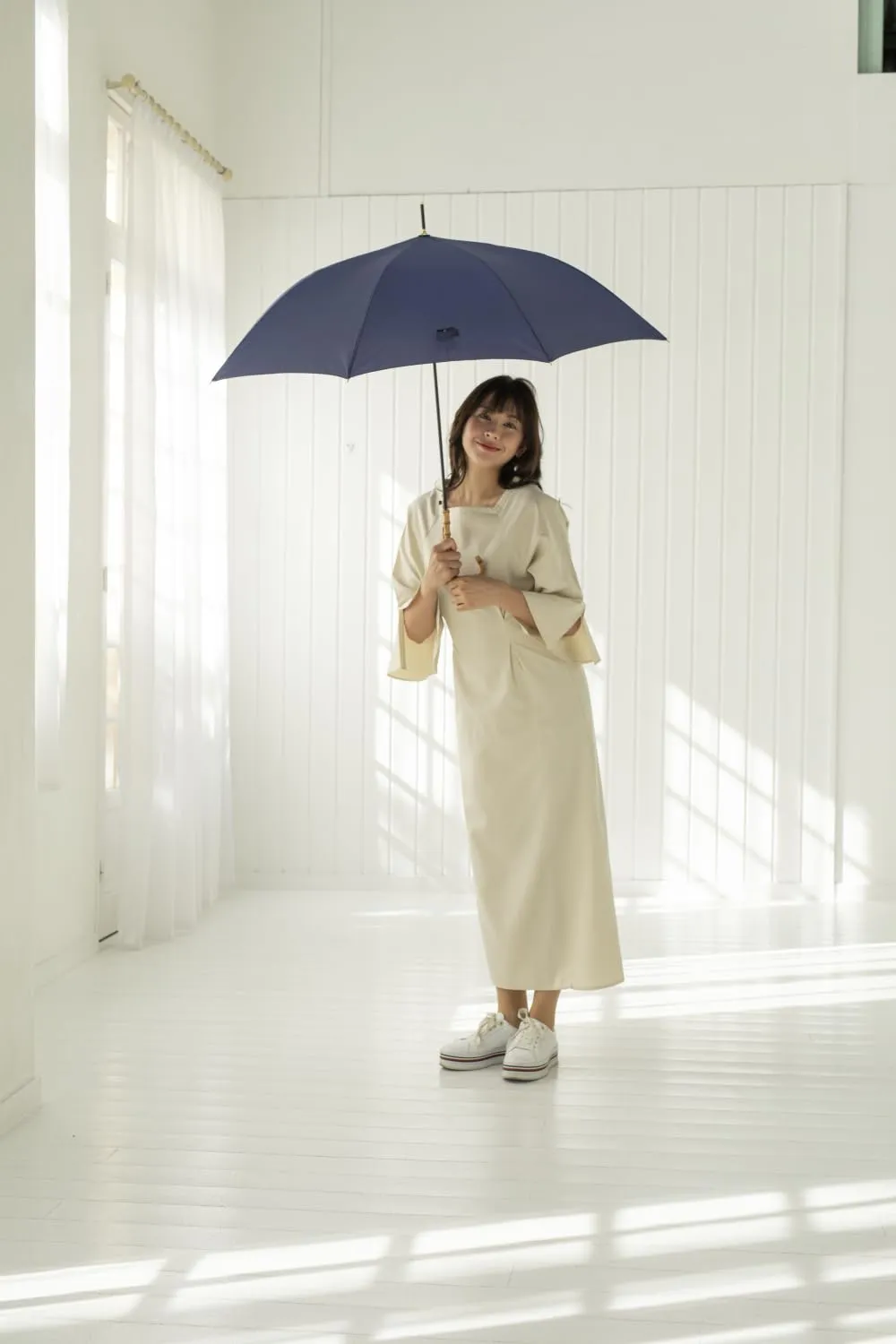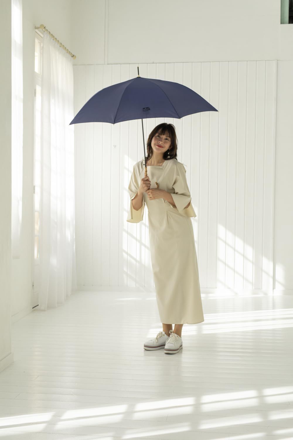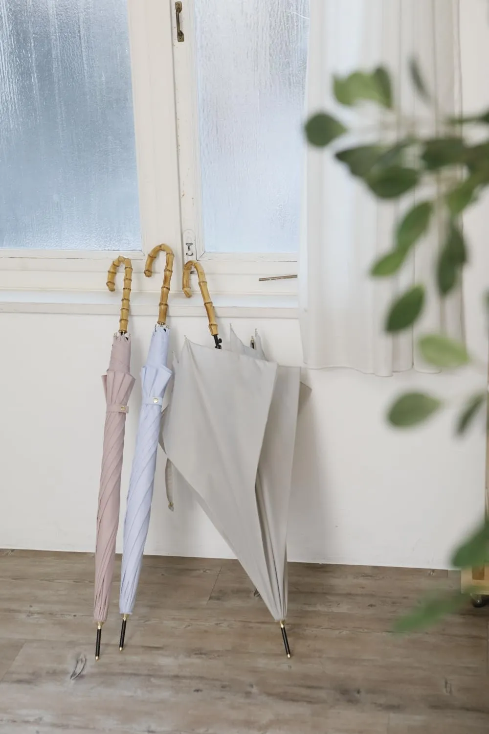 バンブー手元の無地傘です。ニュアンスカラーから定番カラーまで取り揃えました。親骨は、風に強くしなやかで折れにくいグラスファイバー骨仕様です。