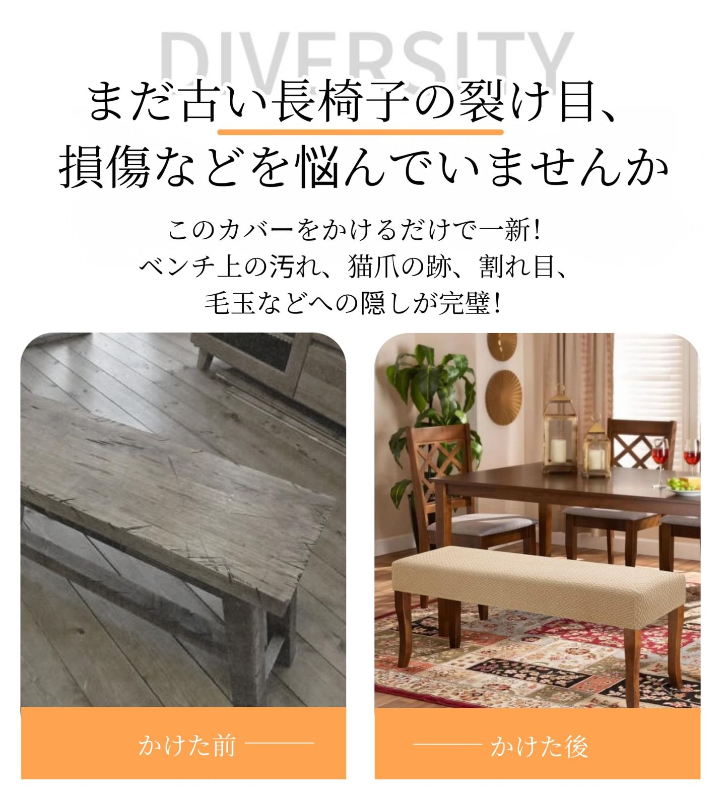 【優れたストレッチ性&全方位の保護】優れた伸縮性のある生地(ポリエステル95%、スパンデックス5%)で様々なサイズの椅子にフィットし、装着も脱着も非常に簡単、女性一人の力でも問題なし。横幅110-120cm、奥行38-43cm、厚さ8-12cm以内の座面に対応可能!全方位しっかり保護して、新しいファッション感あるベンチに変えられます。 ベンチカバー裏面には弾性のある紐付き、伸縮性が高い、ベンチ本体の大まかな形を捉え、ベンチをしっかり包み込みます。