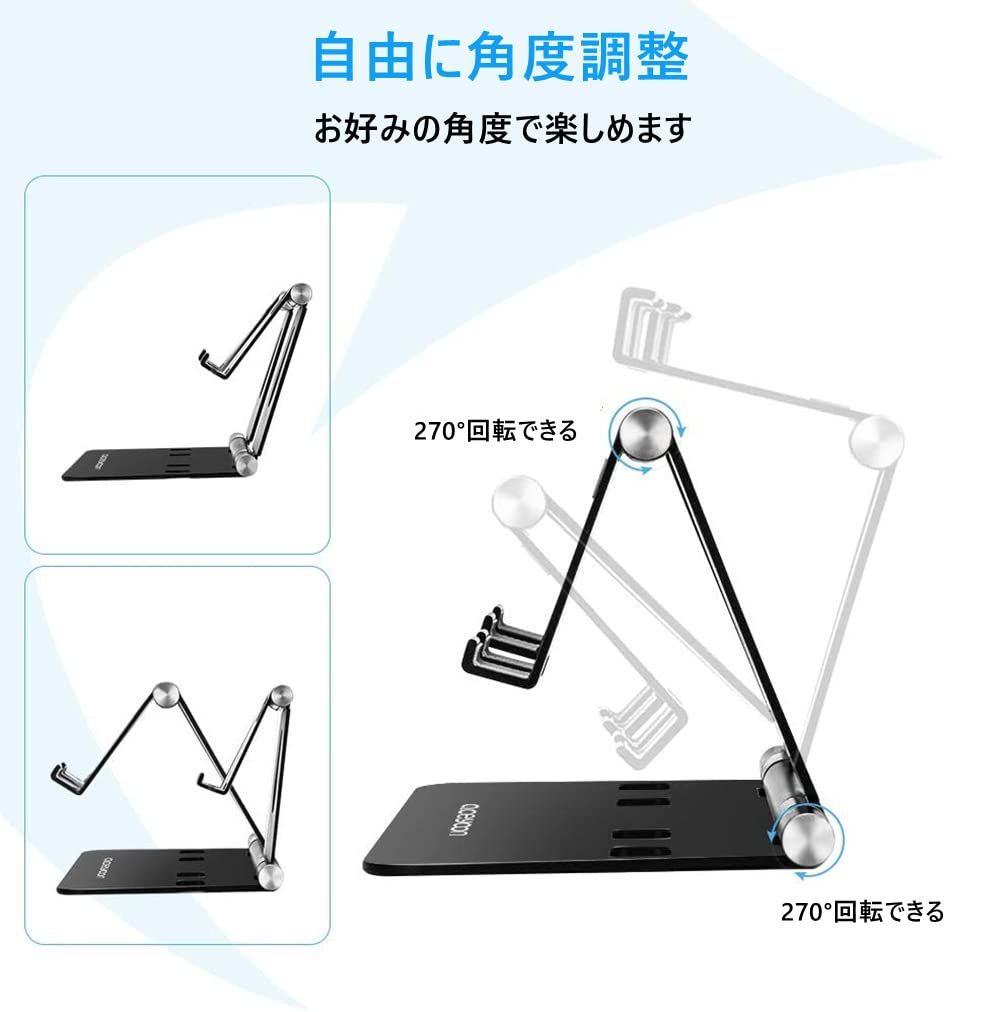 【折り畳み式&持ち運び便利】タブレットホルダーを折り畳んだら、手と同じぐらいな大きさで、かばんやポケットに入れられます。収納と持ち運び便利で、外出中でもアニメ、映画、電子書籍を楽しめます。タブレット置き台は重厚感のあるアルミニウム素材を採用し、優れた耐久性を実現しました。特大のアルミニウム製ボトム、着信時や操作中もガタつかず安定します。スリップを防止するためのシリコンパッドが付いており、擦り傷から大切なデバイスを保護できます。
