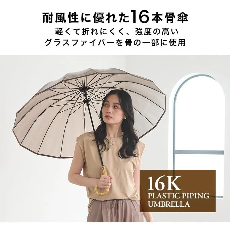 大人気!風に強い16本骨のおしゃれなビニール傘。 節があって持ちやすいバンブーハンドルは、シンプルながらも女性らしい上品な印象を演出します。