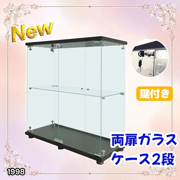 #1998 両扉 強化 ガラス ケース 2段 ブラック 鍵付き 豆脚付き 転倒防止器具付き フィギュア プラモデル プラモ 鑑賞 展示 自宅 店舗 ディスプレイ 付属品 ※一部地域離島別途配送料有