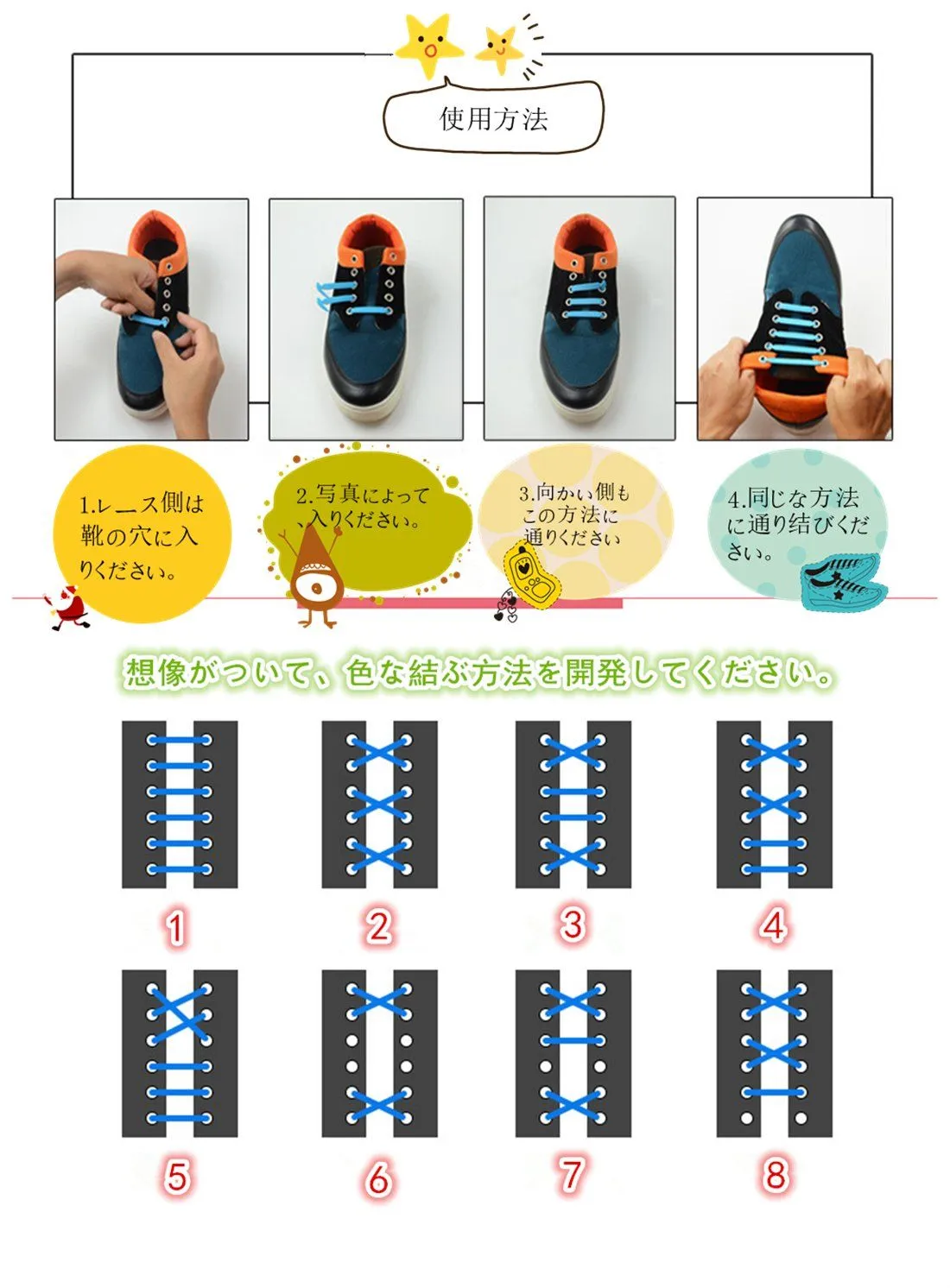 【結ばない靴紐の利点】①一度靴に取り付けた後は、簡単に履いたり、脱いだりできるので、時間を節約し、とても便利です。②ゴムを採用しだから、取り付け方でサイズが自由自在、年齢・性別問わず全て使用できます。③豊富なカラーで自由に組み合わせます。④きれいにしやすい。⑤伸縮性が高いので、裂けにくい、歩くとランニングに快適な装着体験がある。 最後までご確認頂き誠にありがとうございました。 上記をご確認頂き、ご購入いただけましたら幸いです。 何かご不明な点がございましたらお気軽にメッセージからお問い合わせ下さい。