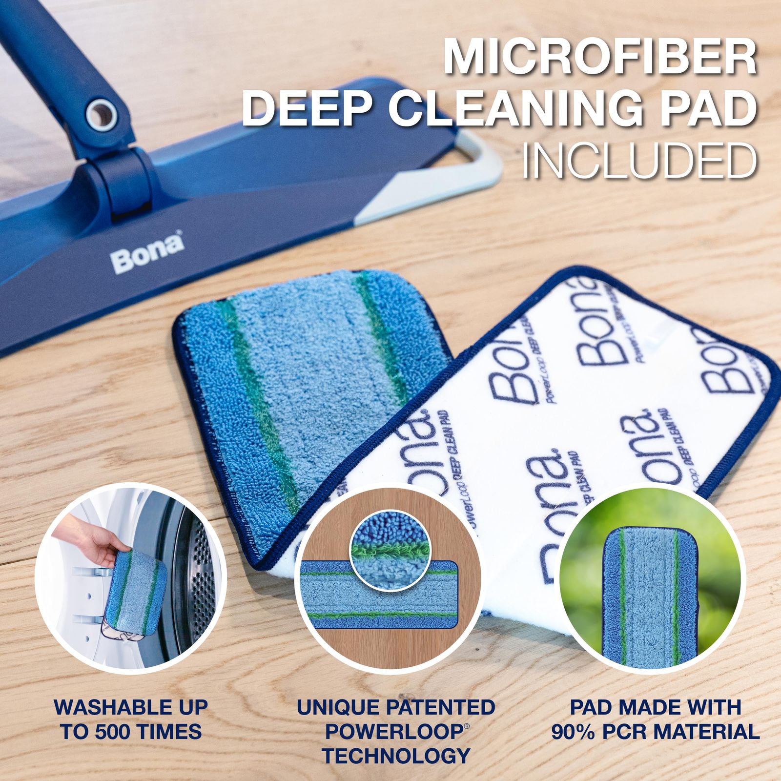 【ガンコな汚れに】Bonaマイクロファイバーディープクリーンパッドは、独自のパワーループテクノロジー??でガンコな汚れを分解。分解された汚れは、青色と水色のマイクロファイバーが吸着します。