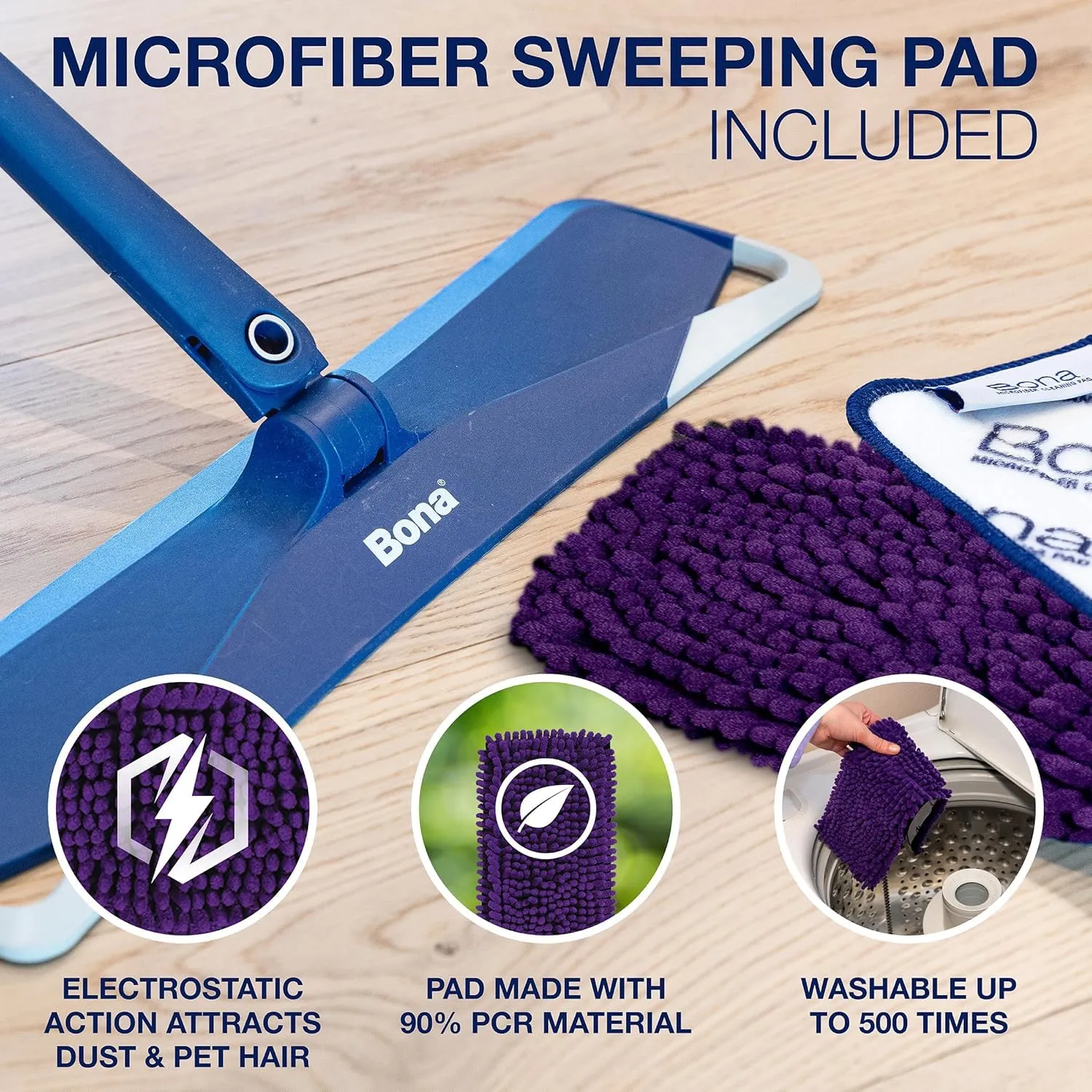 【ペットの毛やフケを除去】Bonaペットシステムスウィープパッドは紫色のもふもふのマイクロファイバーが特長のから拭き用モップパッド。ペットの抜け毛や細かなフケを静電気の力で吸着し、床に汚れを残しません!