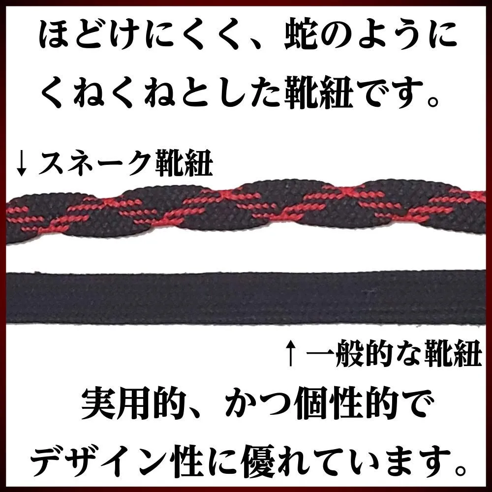 まるでヘビのようにクネクネとした靴紐です。ほどけにくく、見た目もオシャレ。ツートンカラーでシンプルなスニーカーに最適です。日本製で高品質。
