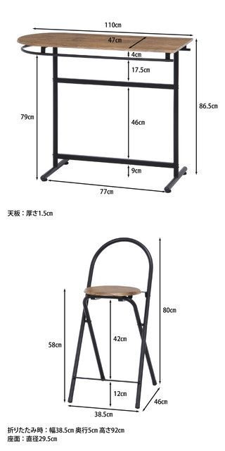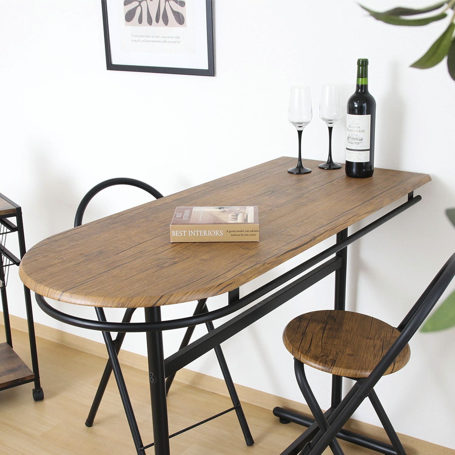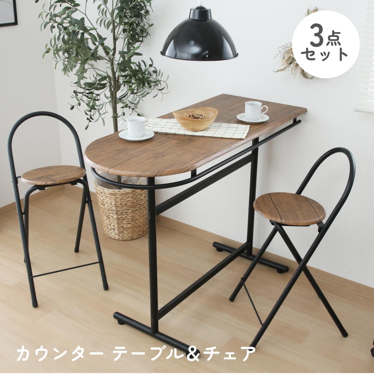 【商品名】 カウンターテーブル & チェアー 3点セット 3060-1 ※当ショップの商品はすべて送料無料となります。ただし、北海道、沖縄県、離島地域への配送はできません。予めご了承のほどよろしくお願いいたします。 ※こちらの商品はご注文後3営業日以内の発送となります。土日祝は出荷をお休みとさせて頂いております。発送までの日数は土日祝を除く営業日となりますのでご注意ください。予めご了承のほどよろしくお願いいたします。 モダンで落ち着いた色合いのカウンターテーブルとチェアのセットです。 コンパクトで圧迫感を出さず、オシャレなカウンターテーブルとして使用できます。 パソコンや書き物などのちょっとした作業机としても活躍します。 チェアは折りたたむことができるので、お掃除の際や使用しないときはちょっとした隙間に収納することができます。 テーブルの脚部にはアジャスターが付いており、ガタツキを防止します。 テーブルサイズ:幅1100×奥行470×高さ965mm チェアーサイズ:幅385×奥行445×高さ800mm 重量:テーブル8.5kg、チェアー2.8kg 材質:MDF、PVC、スチール(エポキシ樹脂塗装) 生産国:中国 組み立て:必要