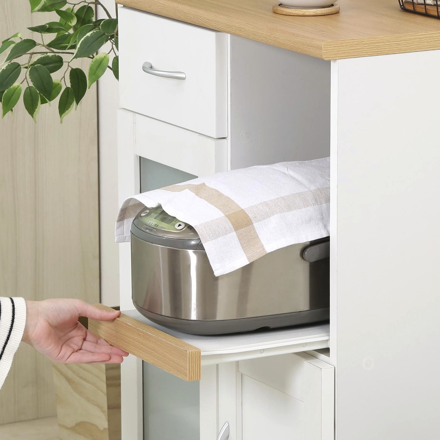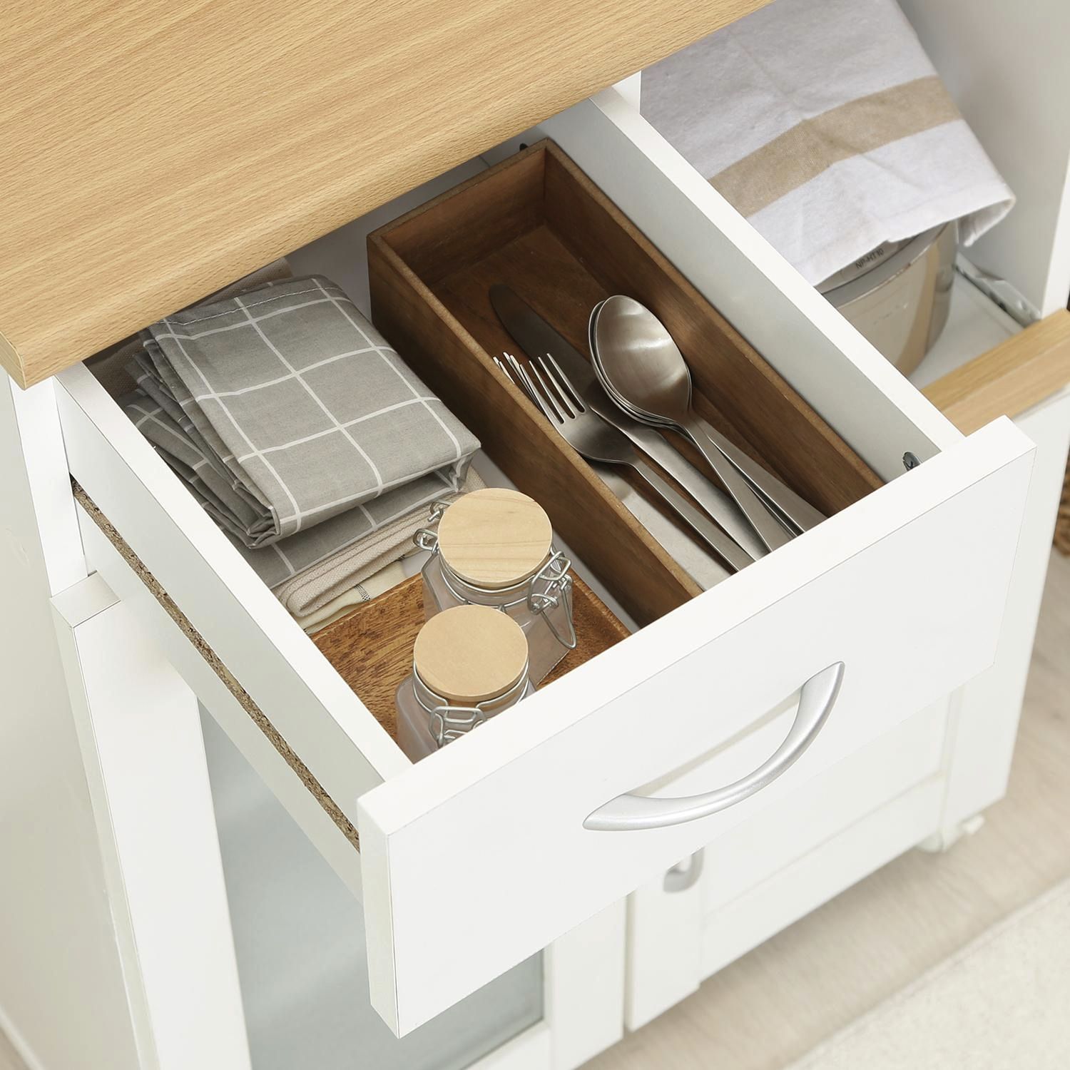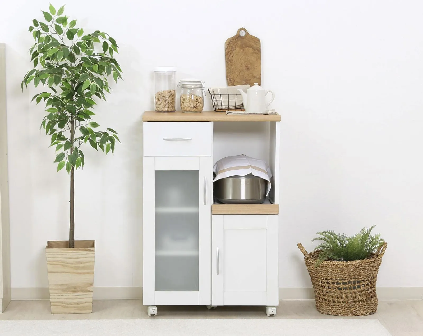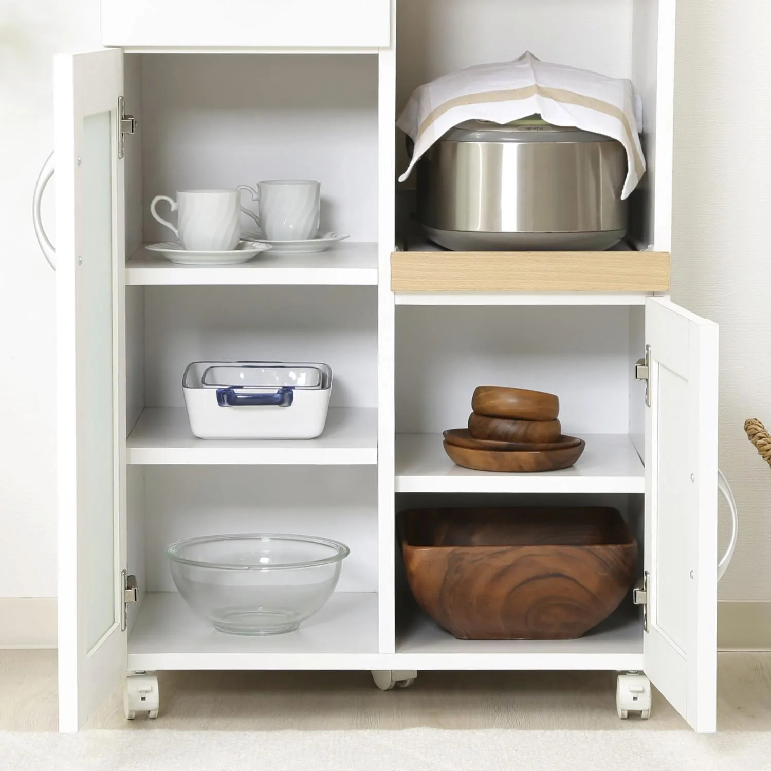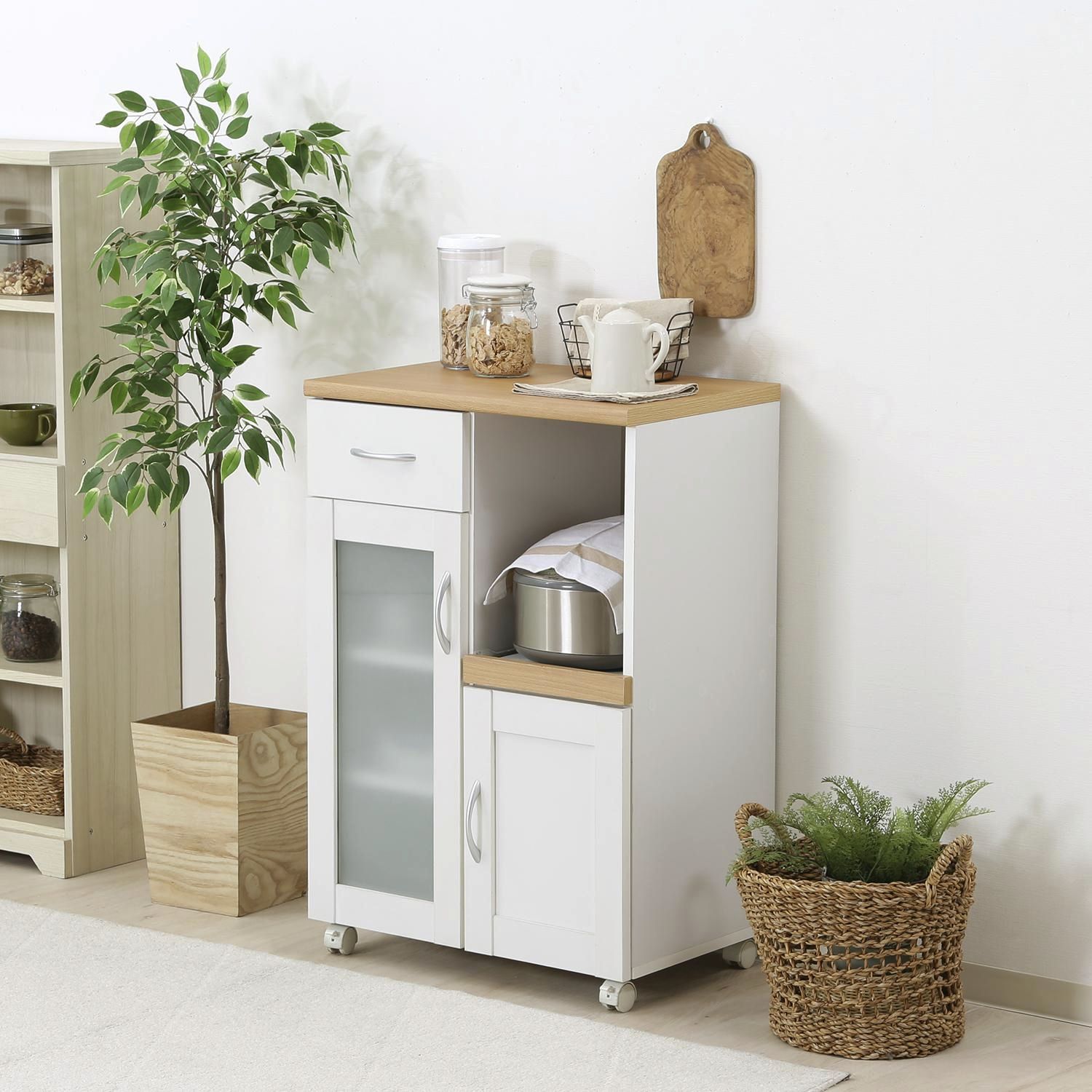 【商品名】 キッチンカウンター サージュ WH×NA 60幅(96818) ※当ショップの商品はすべて送料無料となります。ただし、北海道、沖縄県、離島地域への配送はできません。予めご了承のほどよろしくお願いいたします。 ※こちらの商品はご注文後3営業日以内の発送となります。土日祝は出荷をお休みとさせて頂いております。発送までの日数は土日祝を除く営業日となりますのでご注意ください。予めご了承のほどよろしくお願いいたします。 ホワイト×ナチュラルカラーで、どんなインテリアにも馴染みやすいキッチンカウンターです。 2つの戸棚に分かれていて、細やかな収納が可能。食器や缶詰、お菓子などスッキリ収納できます。 お好みの高さに合わせて、棚の付け替えができます。 引き出して使えるスライド棚です。炊飯時やお湯を沸かす際に出して使うことで、蒸気による棚の劣化を防ぐことができます。 引き出しにはお箸やランチマットなど、かさばる小物をすっきり収納できます。 スライド棚の奥には2口のコンセントがついているので、使い勝手もバツグンです。 サイズ:幅60×奥行39.5×高さ89cm