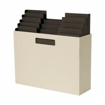 仕切りケース5個付き。A4サイズのクリアホルダーが収納可能。本棚にすっきり収納できる。持ち運びに便利な取っ手付き。