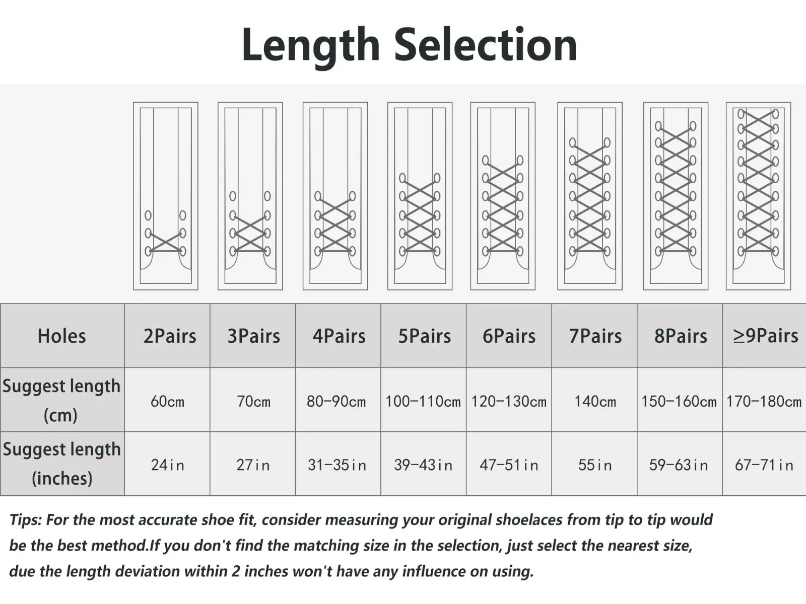 ・最も正確な靴のフィット感を得るには、元の靴ひもを先端から先端までで測定したほうがいいです。