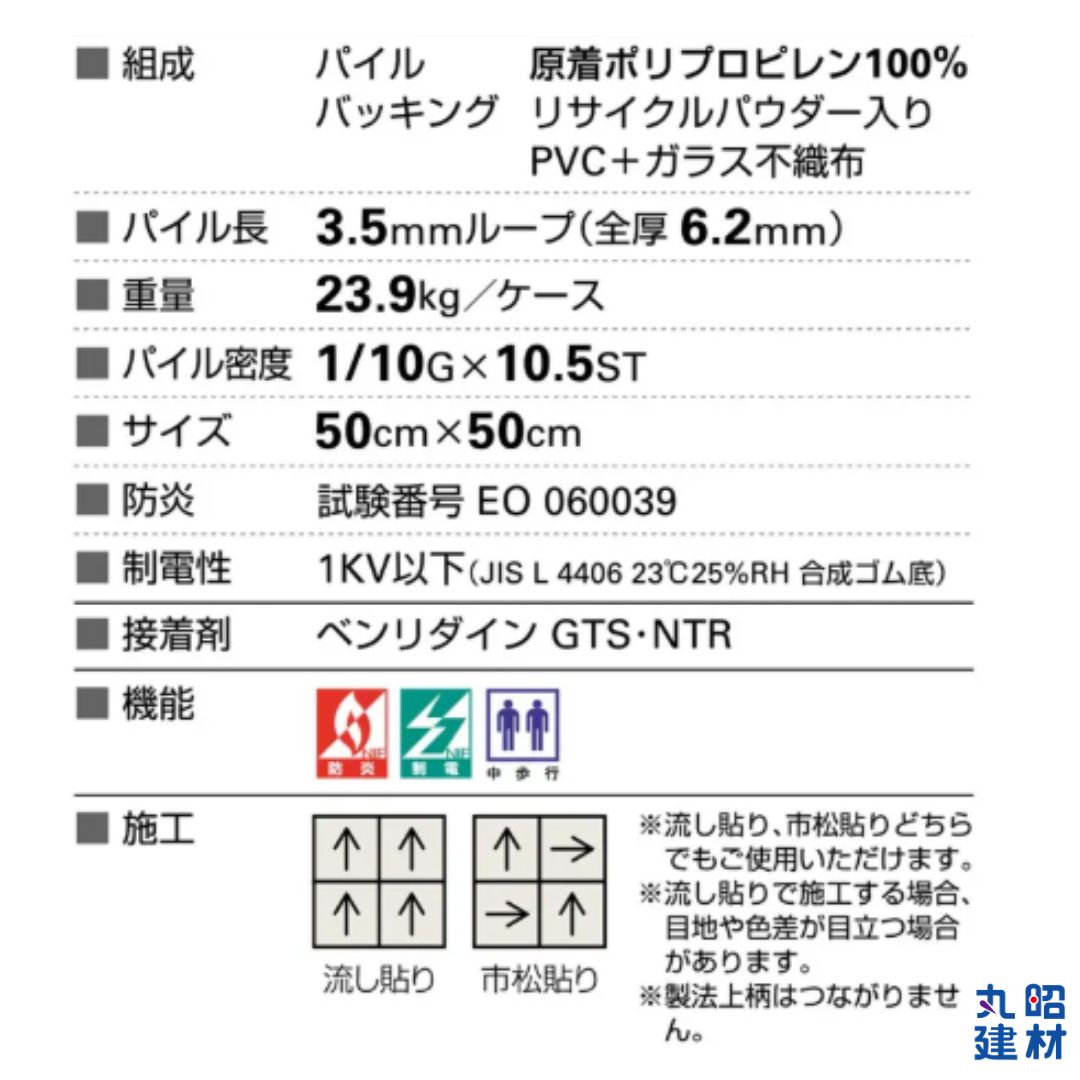 【訳あり】サンゲツ sangetsu カーペットタイル NT-350V NT-308V 9枚入 商品を一部使用しているため、本来1ケース20枚入りのところ9枚での販売でございます。 一部使用のため開梱しておりますが商品の内容に問題はございません。 ・品番:NT-308V ・サイズ:500×500mm ・厚さ:6.2mm ・入数:9枚/ケース ・組織:原着ポリプロピレン100% ・バッキング:PVC+ガラス不織布 ・パイル密度 : 1/10G×10.5ST ・他社参考価格(新品1ケース):約¥9,800~¥14,278