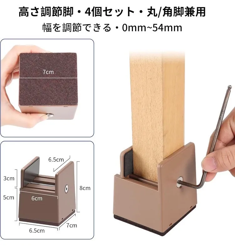【テーブルたかさ調節】パッケージ内容:4個セット(高さ5cm)。適応脚サイズ0~5.4cm調節可能。