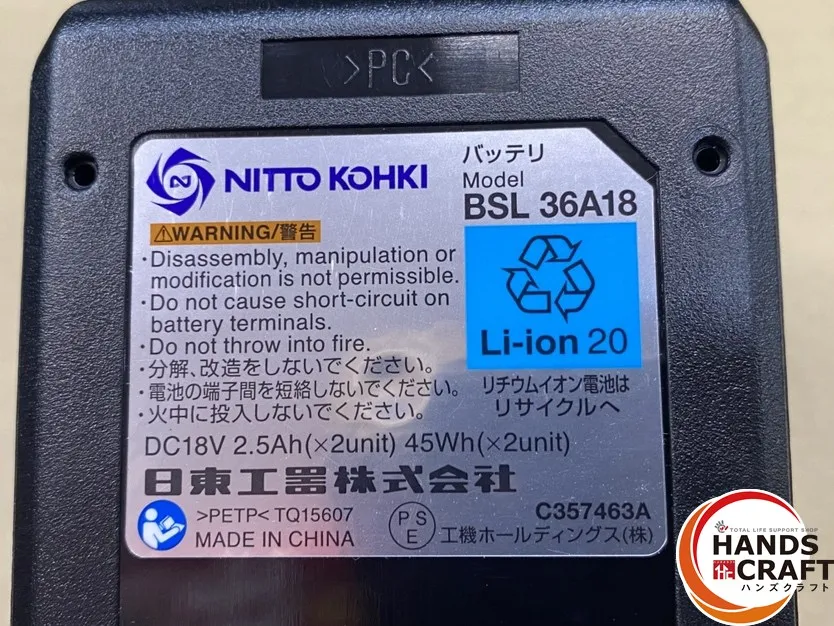 ◆バッテリー仕様・・・型番:BSL36A18 届出事業者:工機ホールディングス株式会社 容量等:DC18V/2.5Ah