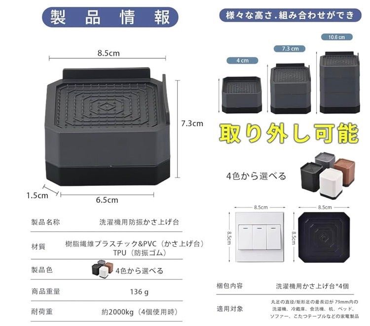 【洗濯機かさ上げ台】 サイズ:8.5L x 8.5W x 7.3H cm(2層)。 セット内容:4個入り。耐荷重:約2000kg(4個使用時)。 ※適用対象:丸足の直径/矩形足の最長辺が79mm内の洗濯機、冷蔵庫、食洗機、机、ベッド、ソファー、こたつテーブルなどの家電製品・家具(85cm以上はつなぎ合わせる必要があります)