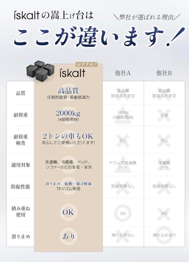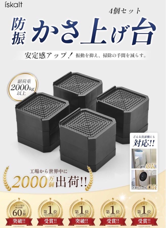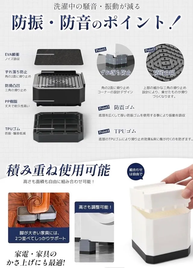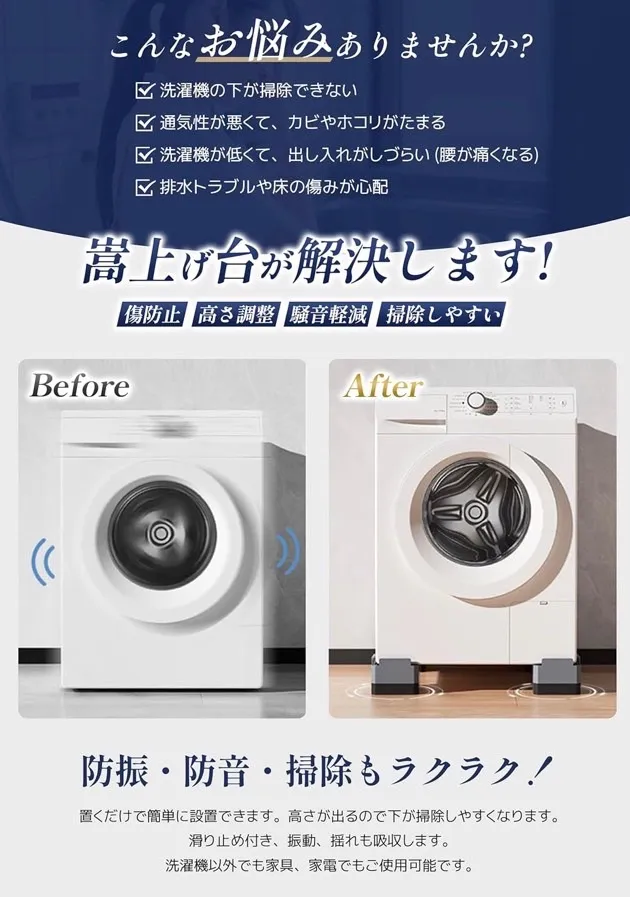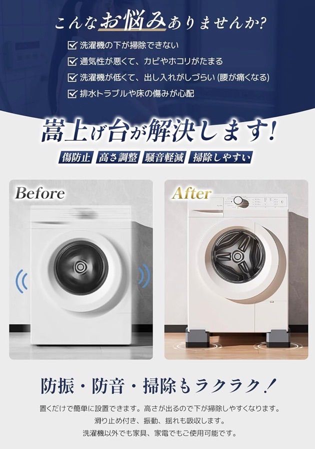 【取り付け簡単、防振、緩衝、防音に】地震による振動、衝撃、揺れを最小限的に抑え、転倒、ズレ、散乱を効果的に防ぐことができます。置くだけ簡単設置,接着不要で簡単に防振・防音効果が得られます。付属の静音パッドは、使用時にかさ上げ台の上に置くだけで、騒音を吸収するだけでなく、接触面の摩擦も効果的に減少し、洗濯机の足と家具の足をさらに保護します。