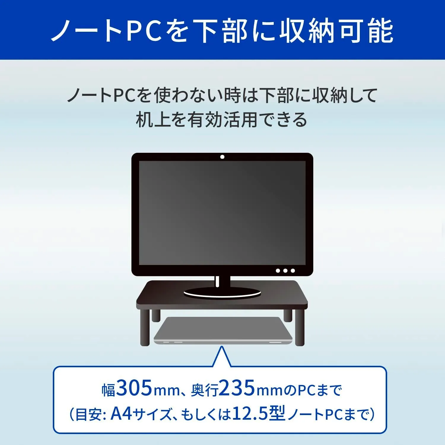 幅305mm、奥行235mmのPCまで下部に収納可能(目安: A4サイズ、もしくは12.5型ノートPCまで)