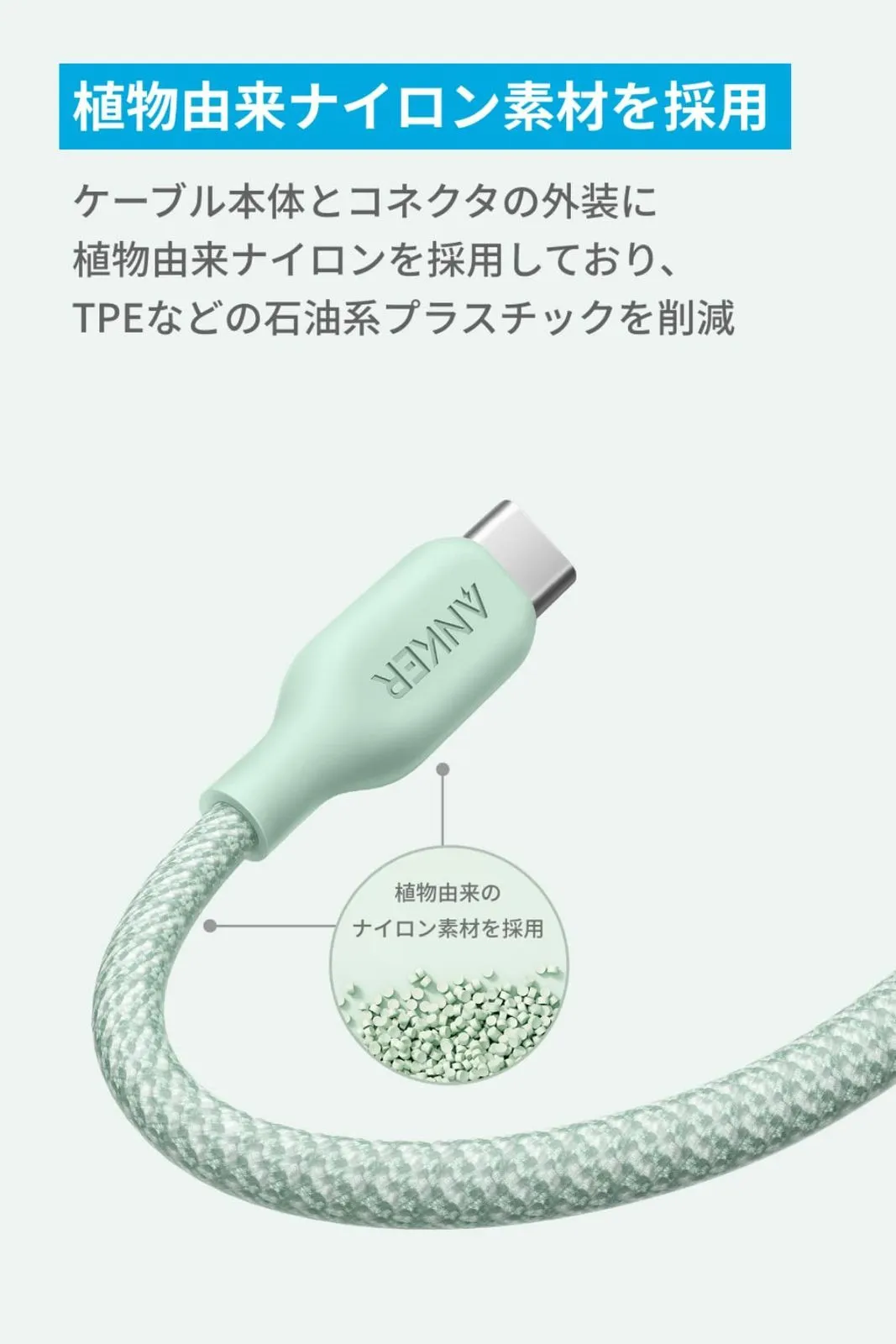 植物由来ナイロン素材を採用:ケーブル本体とコネクタの外装に植物由来ナイロンを採用しました。これによりTPEなどの石油系プラスチックを削減することができます。