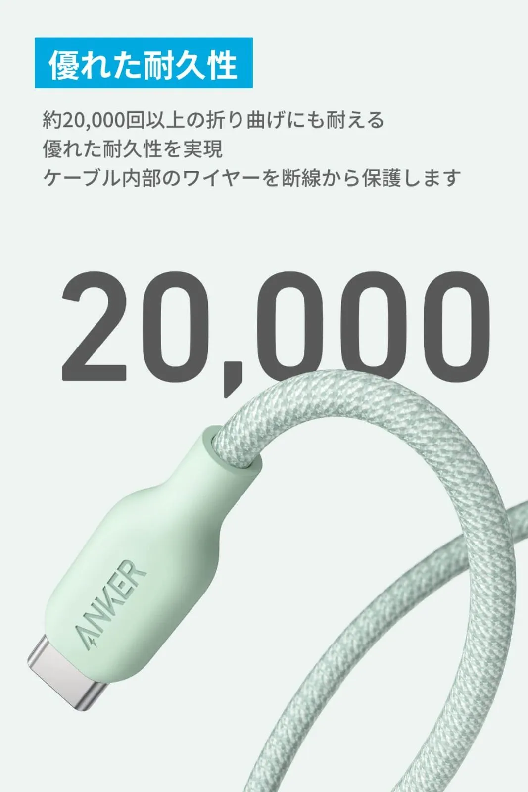 優れた耐久性:20000回以上の折り曲げにも耐える優れた耐久性を実現しているため、ケーブル内部のワイヤーを断線から保護し、安心して充電することができます。