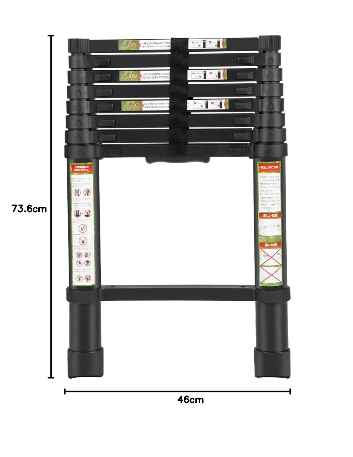 【サイズ詳細】2.6メートルタイプは折り畳み時サイズ(約):幅(足含む)46cm×奥行き7cm×高さ73.6cm 展開時サイズ(約):幅(足含む)46×高さ260cm 階段数量:ステップ9個(最上段を含めて10個)となっており、ステップの幅は各4cmとなっております。 重量:6.85kg 耐荷重:150Kg