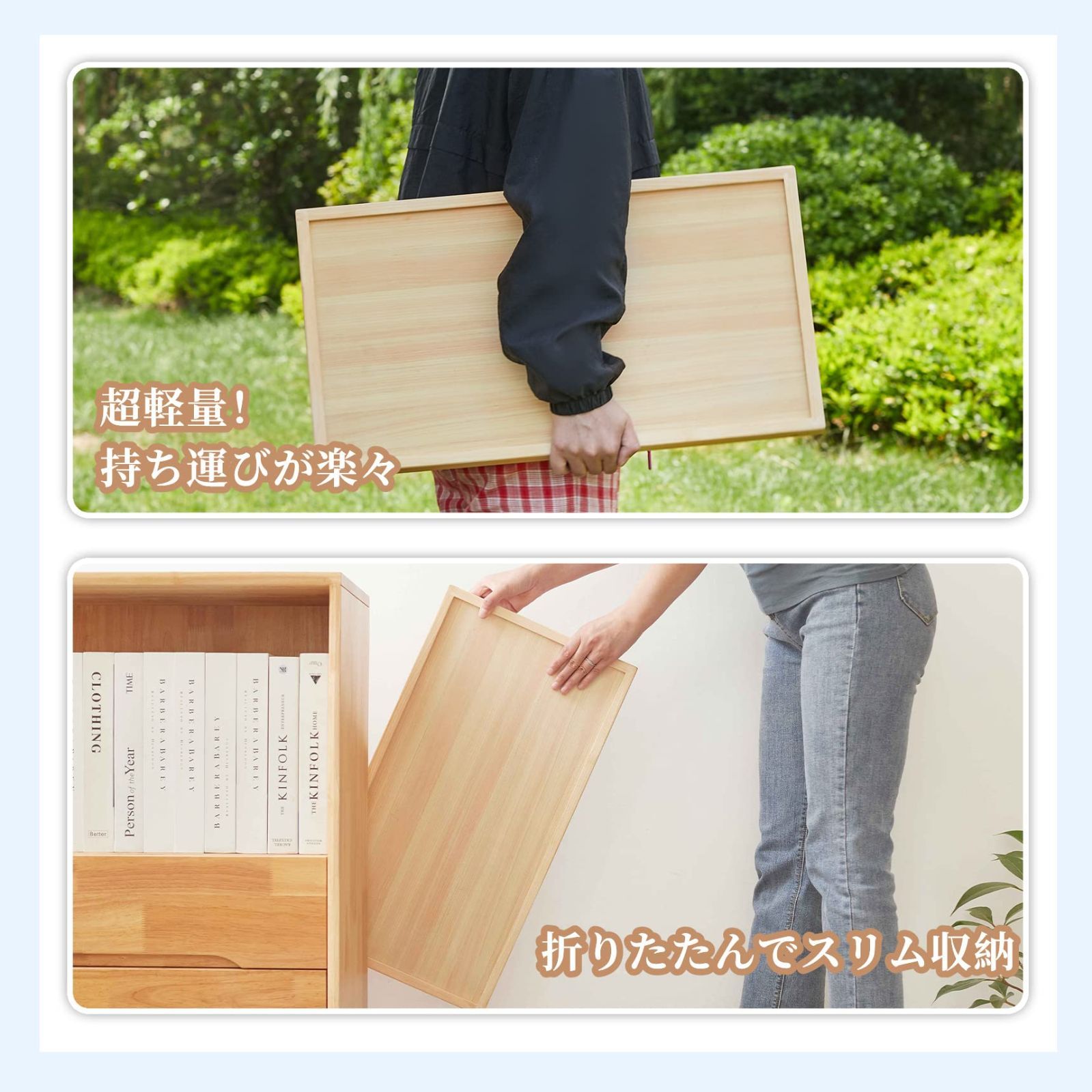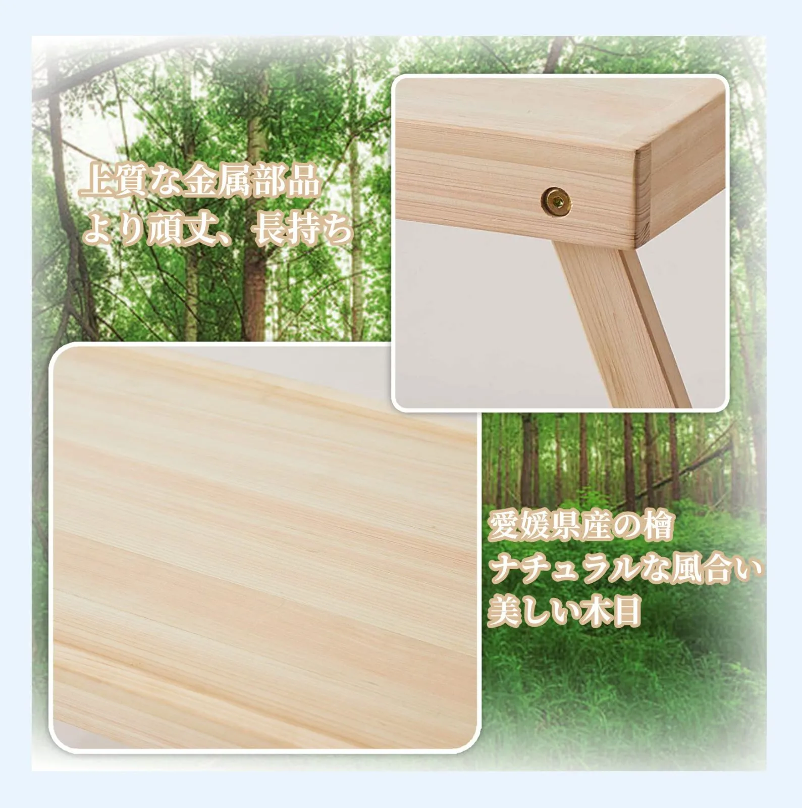 素材: 愛媛県産の檜で作られた無塗装の折りたたみローテーブルです。ヒノキの豊かな香りの中、抗菌・抗カビ・防虫・防ダニ効果が期待できます。シンプルでオシャレな外観です