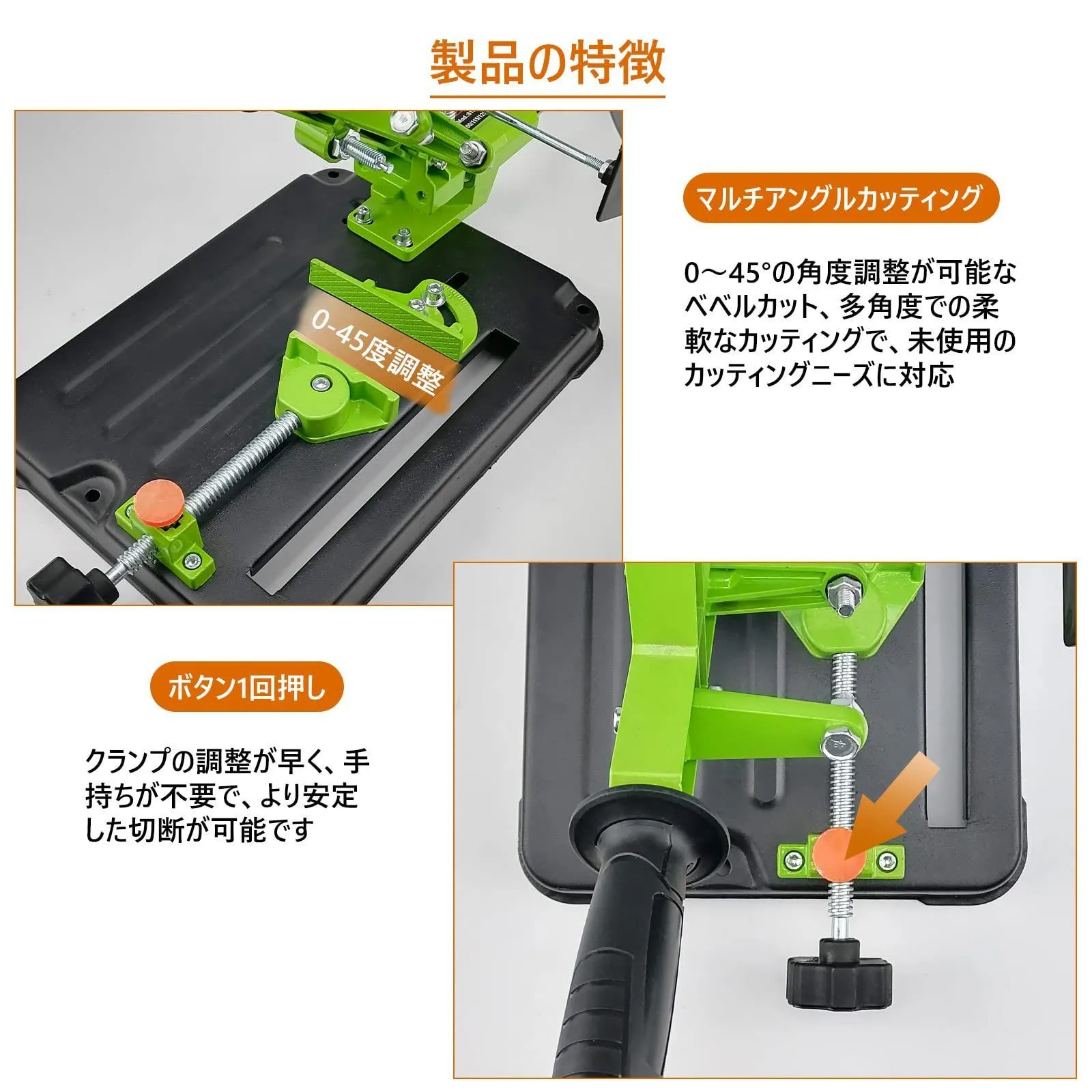 【45度クランプ】:調整可能なクランプを使用すると、切断角度を簡単に調整できます。クイッククランプのスイングは0度から45度です。最大クランプ角度は45度で、クランプ幅は80mmです;0度で,最大クランプ幅は150mmです。