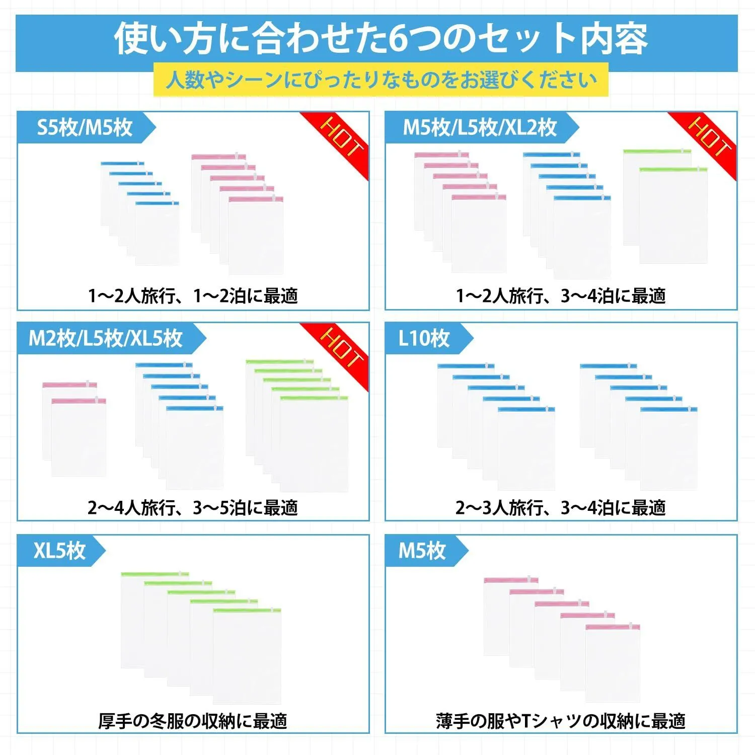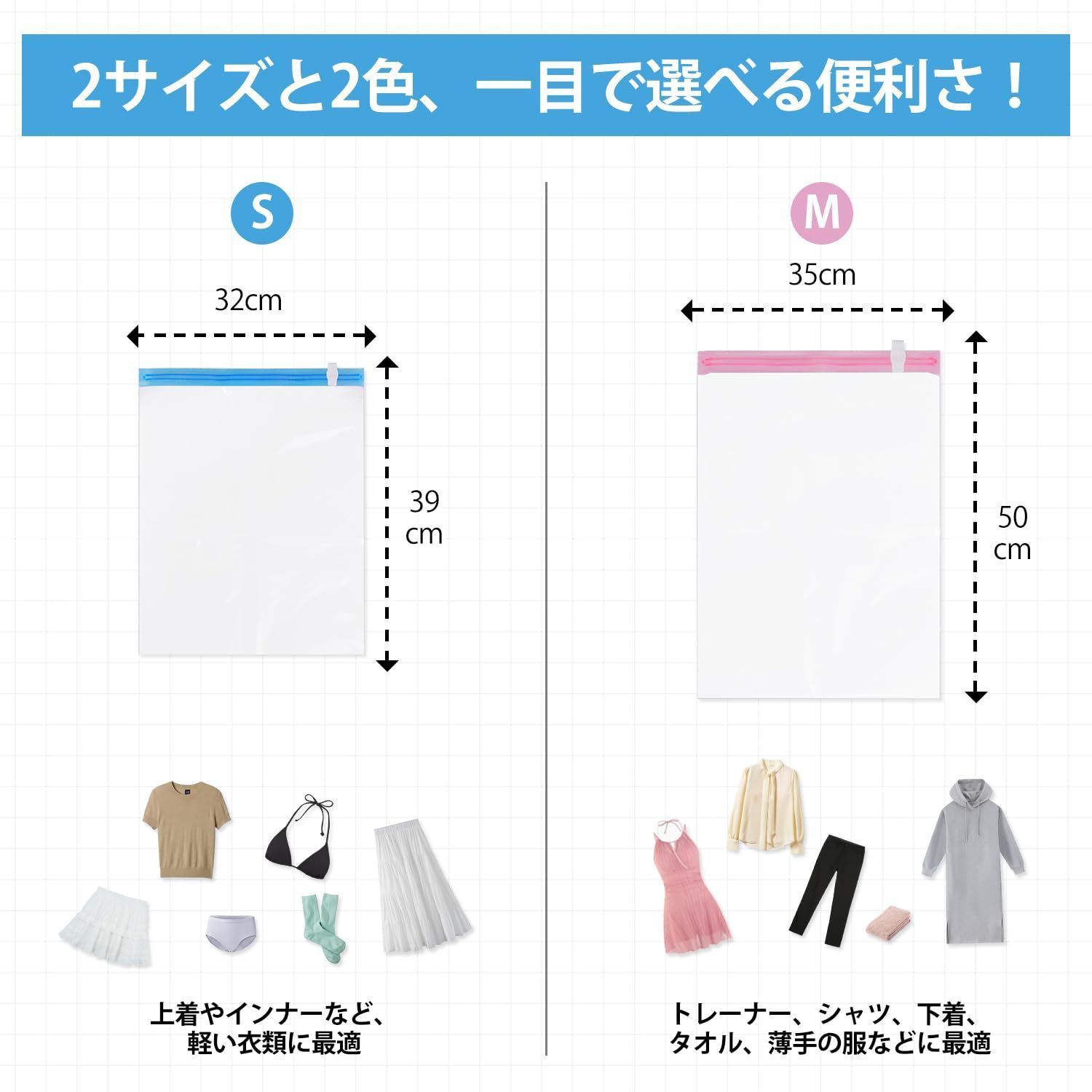【使いやすい設計】透明な仕様で中身が一目で分かるので、服を探す手間が省け、スーツケースも整然と保てます。また、Mサイズ5枚、Sサイズ5枚の圧縮袋セットで、日ごとに着る服を一つの袋にまとめておくと、毎日の服装の準備がスムーズになります。出張や旅行に最適です。さらに、Mはピンク、Sはブル