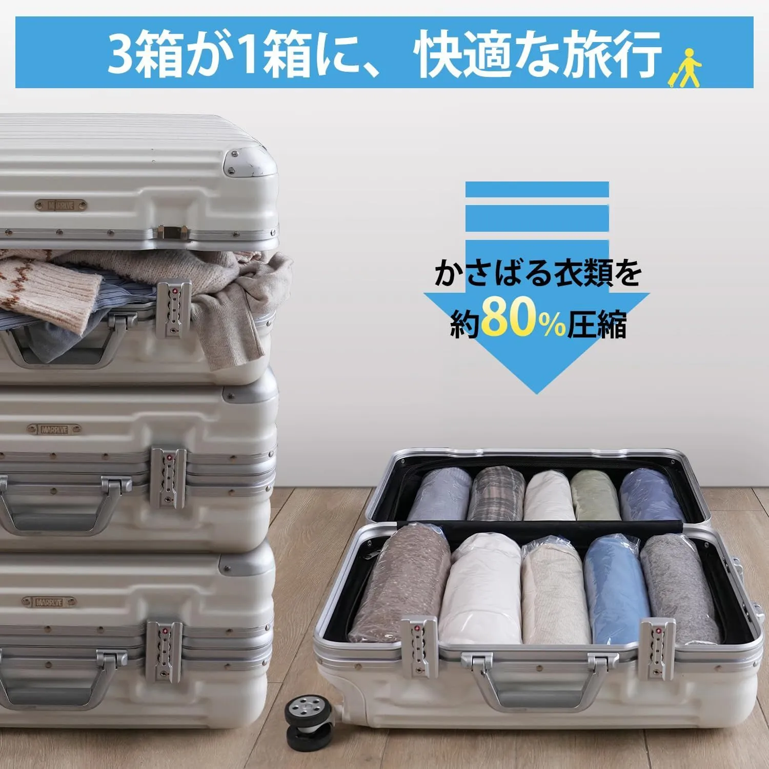 【かさばる衣類を約80%も圧縮!】旅行や衣替えの際に頼りになる手巻き圧縮袋です。ポンプや掃除機は不要で、手でクルクルと巻くだけで瞬時に空気が抜けます。スーツケースやタンスなどの収納スペースを効率的に整理整頓でき、圧縮バッグとは異なり、ほとんど重量を増やさずに使えるため、元々重い荷物に追加の負担を感じることもありません。手軽にすっきりとした収納を実現し、旅行の荷物をスマートにまとめるのに最適です。