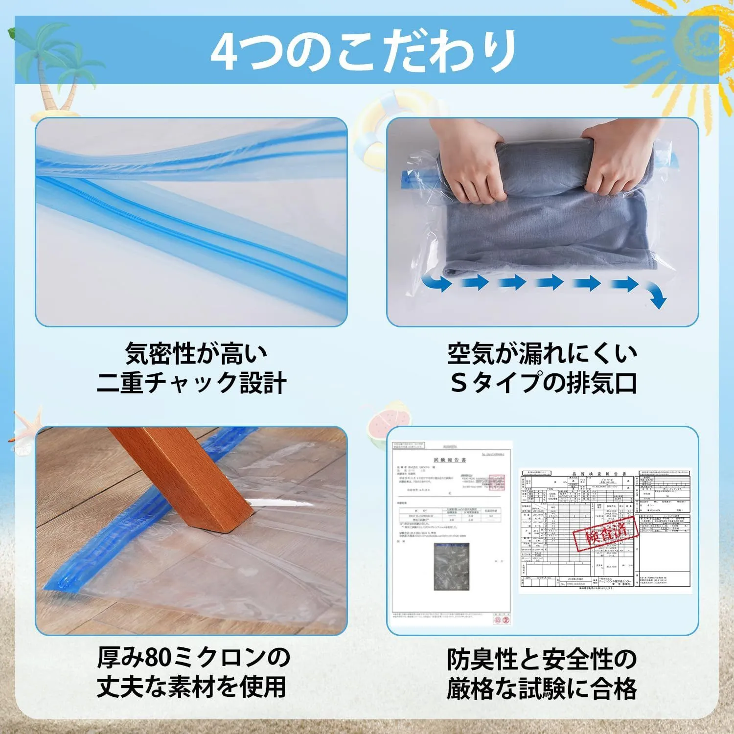 【頼れる衣類保護!高耐久性と優れた密封性】この圧縮袋は、高品質なPA+PE素材を使用し、柔軟性と耐久性を兼ね備えています。従来品よりも1.5倍の厚みで、破れにくく何度も繰り返し利用可能です。さらに、防水性と密封性を確保するため、空気が漏れない二重チャック構造を採用しています。真空状態にすることで衣類を湿気やほこりから守り、カビやダニの侵入を効果的に防ぎ、長期間の収納でも衣類が清潔で新鮮な状態を保ちます。