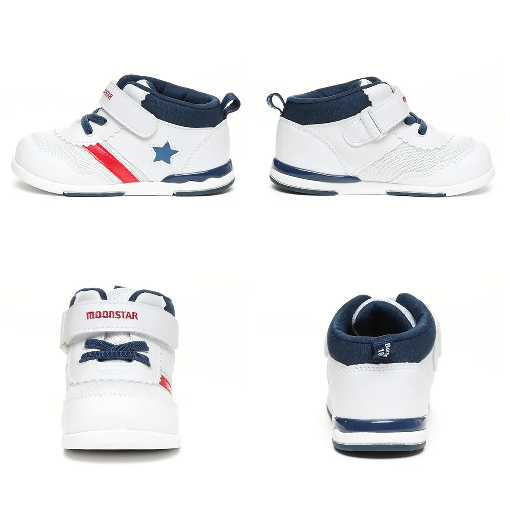 「こどもの足にいいことぜんぶ」の想いから生まれた機能シューズ「ムーンスター キャロット」HI!!シリーズのベビーシューズです。脱ぎ履きしやすいゴム紐×バンドタイプです。通園やお出かけなど、シーンを選ばずに履いていただけるクラシックなデザインです。好評につき、新色のグリーン、アイボリー、ブラック/ホワイトをご用意しました。子どもの足の成長をサポートする「4つの機能(つま先ゆったり/カウンターボックス/フレックスジョイント/機能性カップインソール)」に加え、アーチを支え足のねじれを防ぐハードシャンクも搭載しており、足の健やかな発育を促します。重さは13.0cmで片足約110gです。