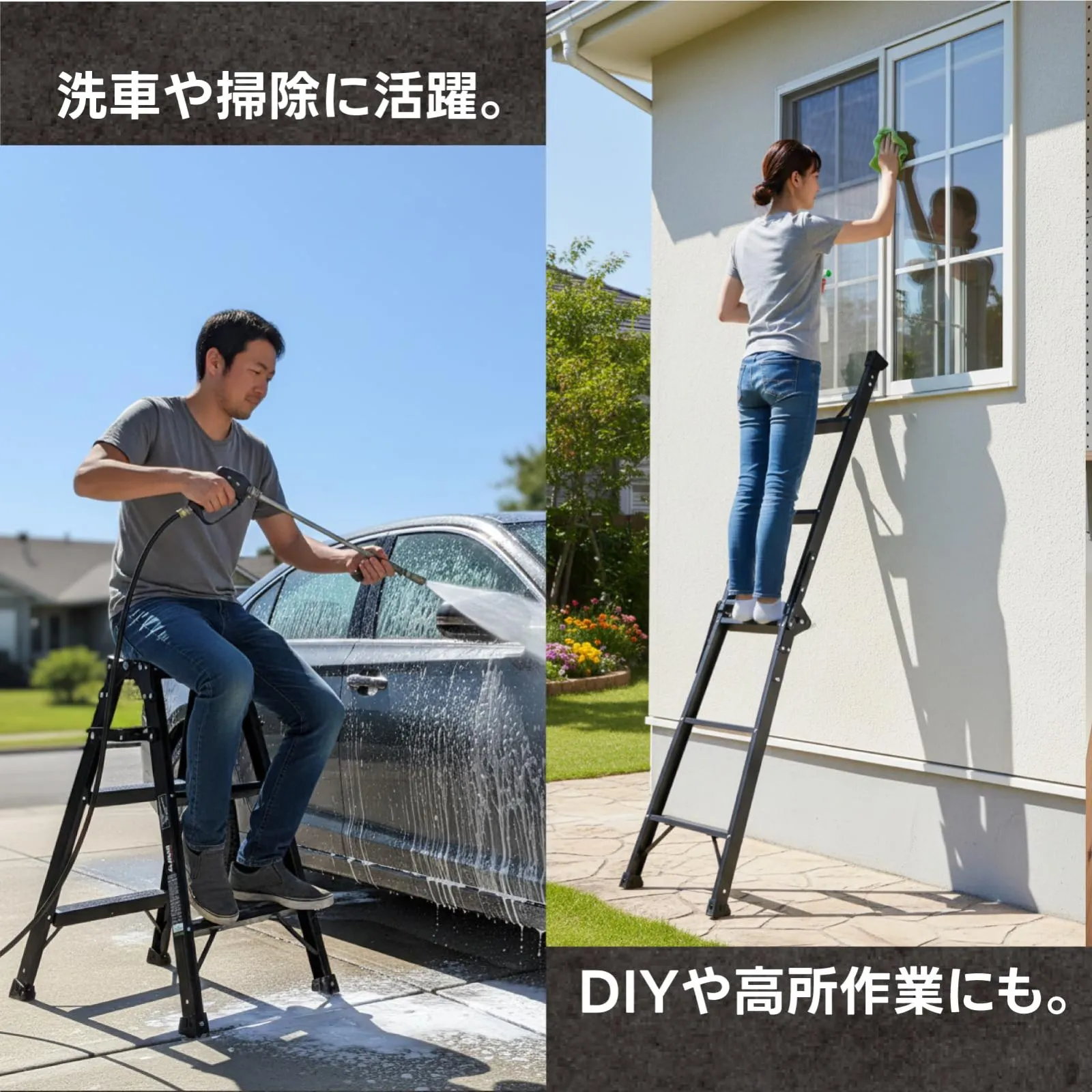 【2WAY仕様】脚立としても、はしごとしても使える兼用設計。洗車や高所作業に便利。 ・