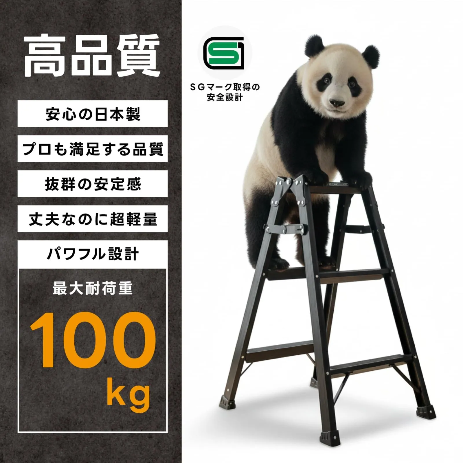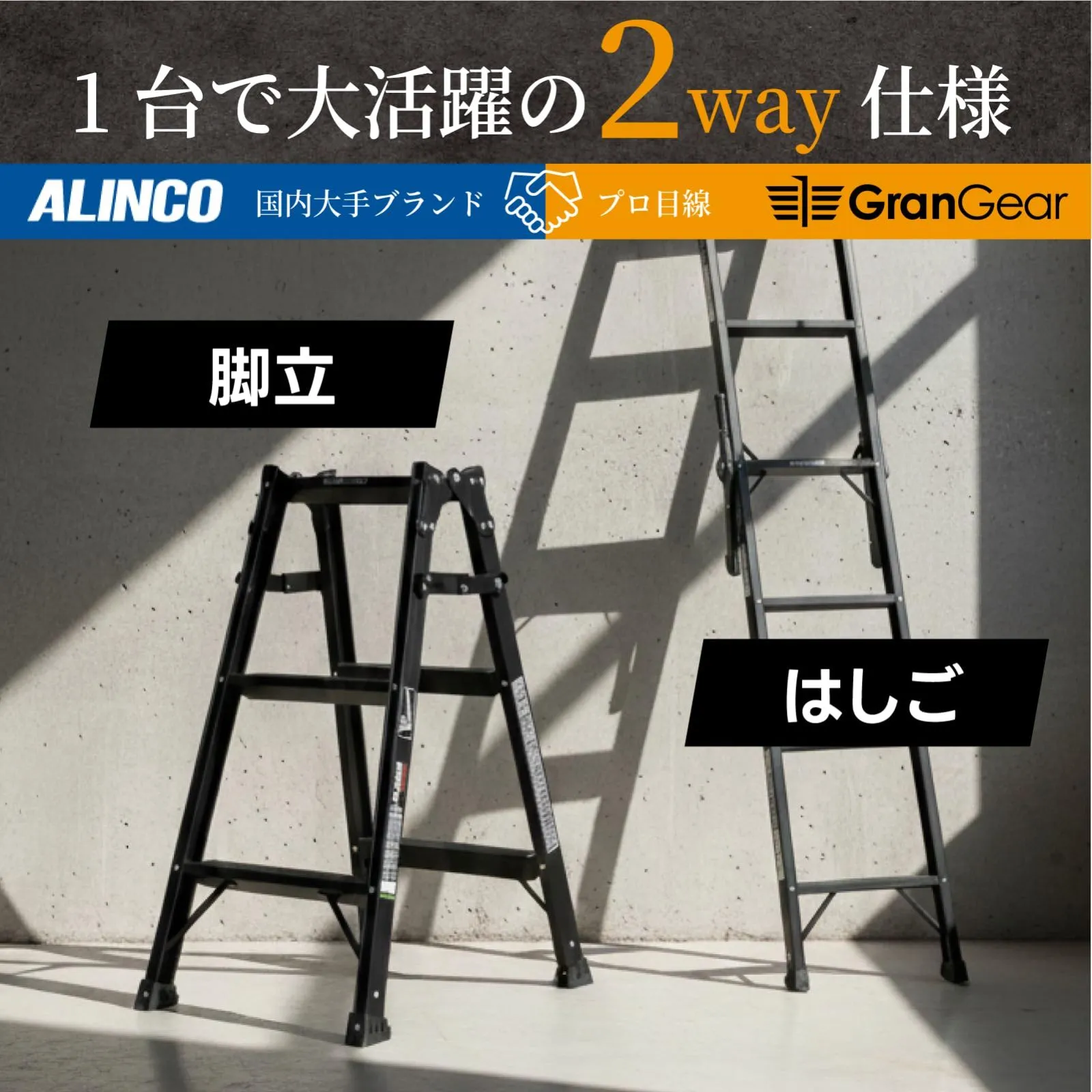 【信頼のメーカー品質】SGマーク取得済みの安全設計。しっかりした作りで長く 使える。 ブラックカラーの兼用脚立(はしごにも可変する)。プロの満足度を追求したブランド GranGear (グランギア) と ALINCO(アルインコ) とのコラボ商品。 各ステップにすべり止めテープ付。両面ワイドステップ55mm幅広踏ざん採用。耐久性と安全性が向上したはしご兼用脚立のスタンダードモデル。 ・