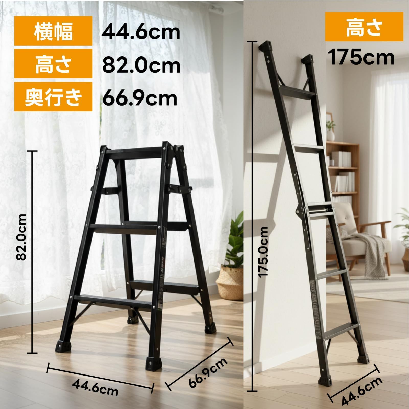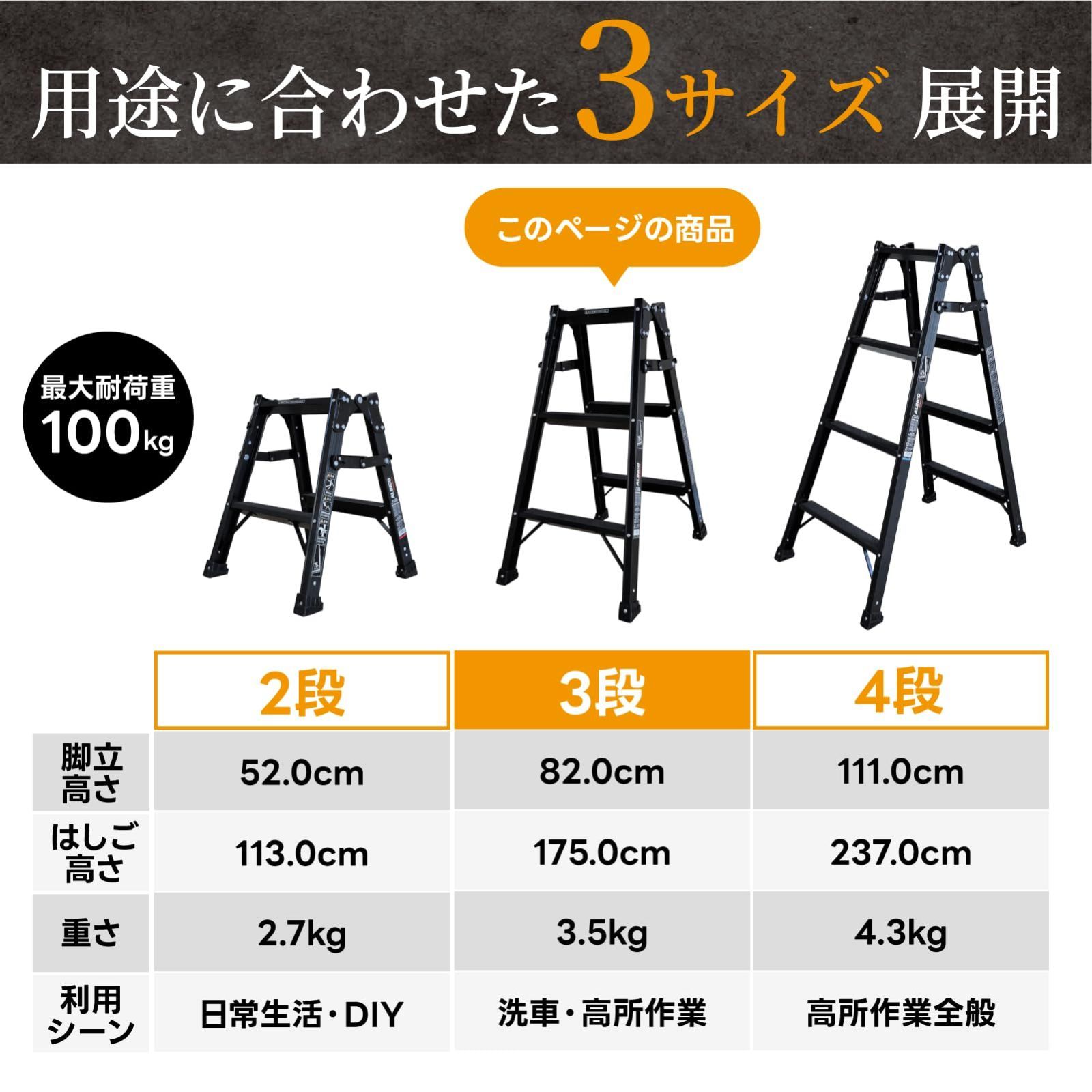 【滑り止め付きで安全】ステップ全面に滑り止め加工。昇降時もグリップ力抜群。 脚立としても、はしごとしても使える兼用設計。洗車や高所作業に便利。