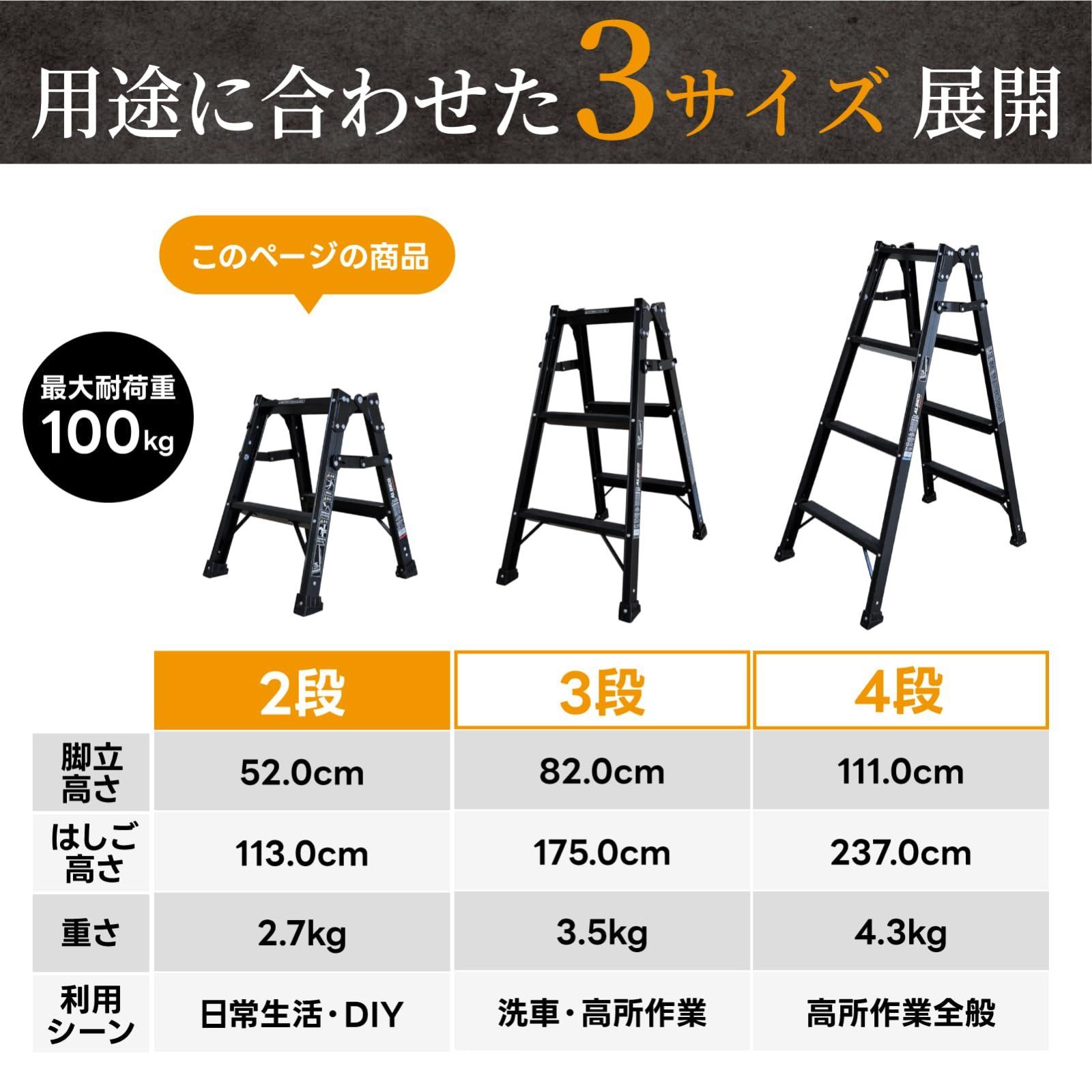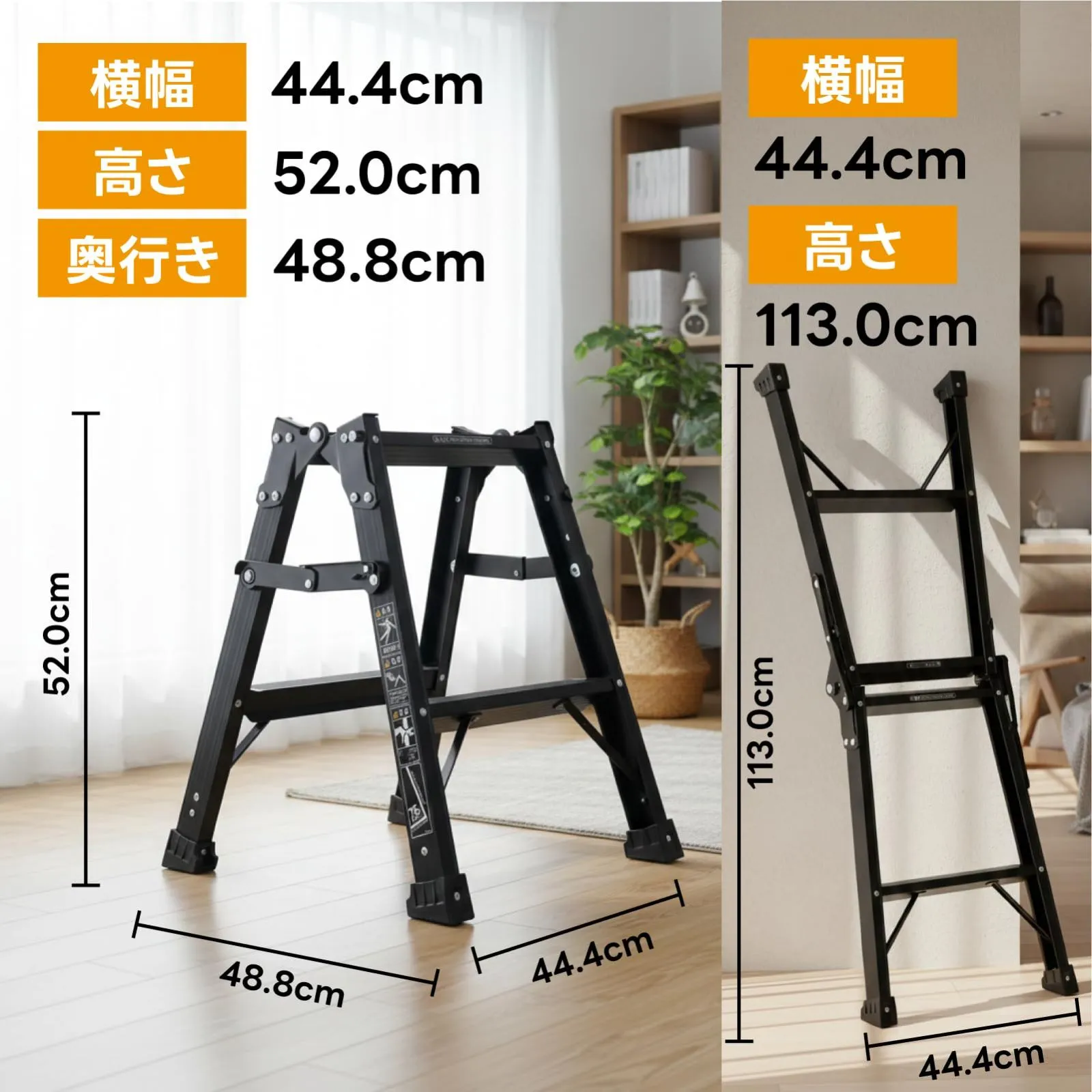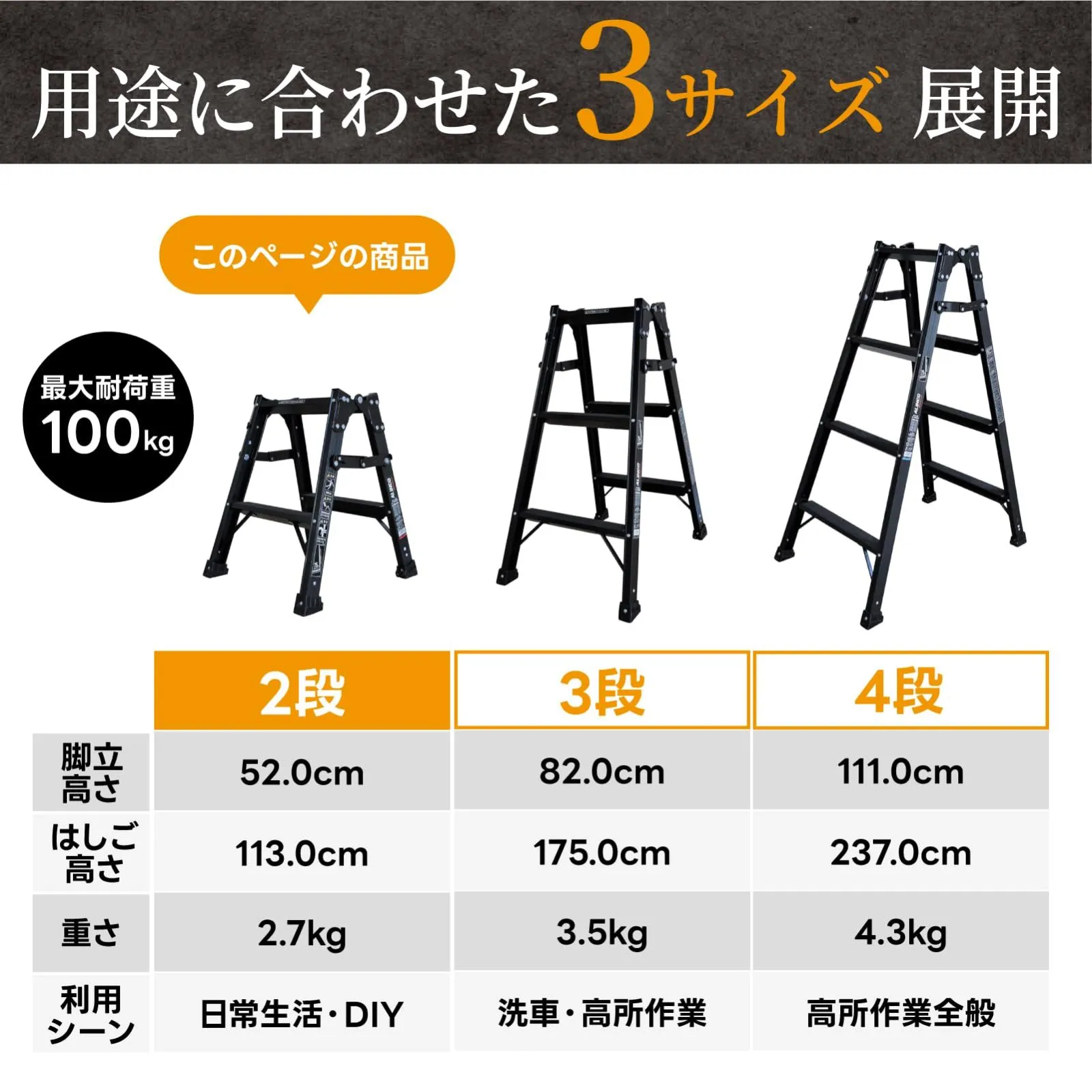 【滑り止め付きで安全】ステップ全面に滑り止め加工。昇降時もグリップ力抜群。脚立としても、はしごとしても使える兼用設計。洗車や高所作業に便利。