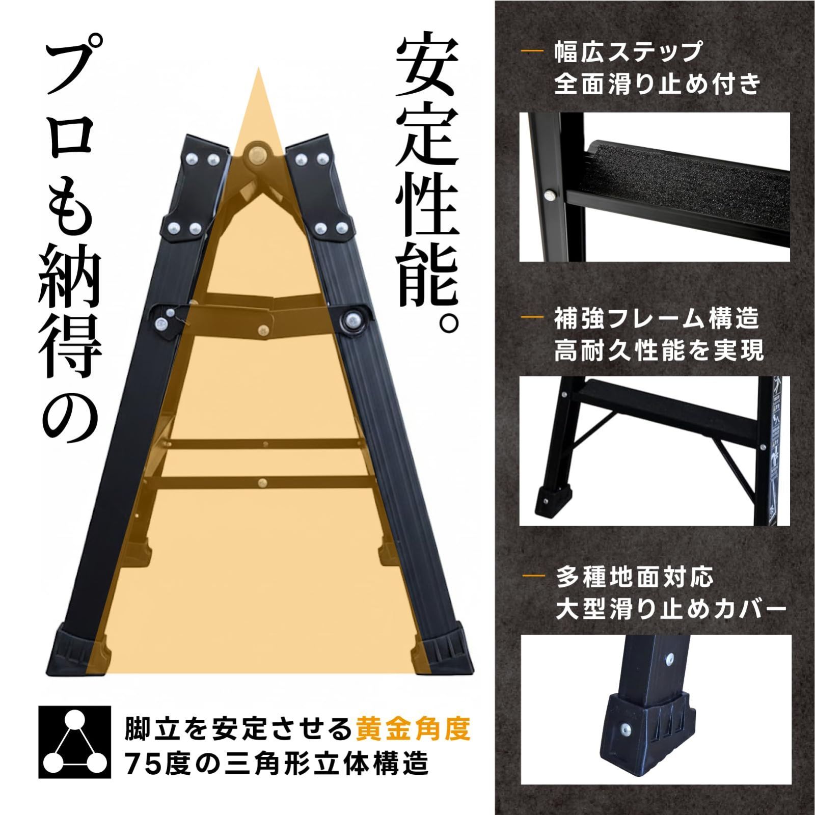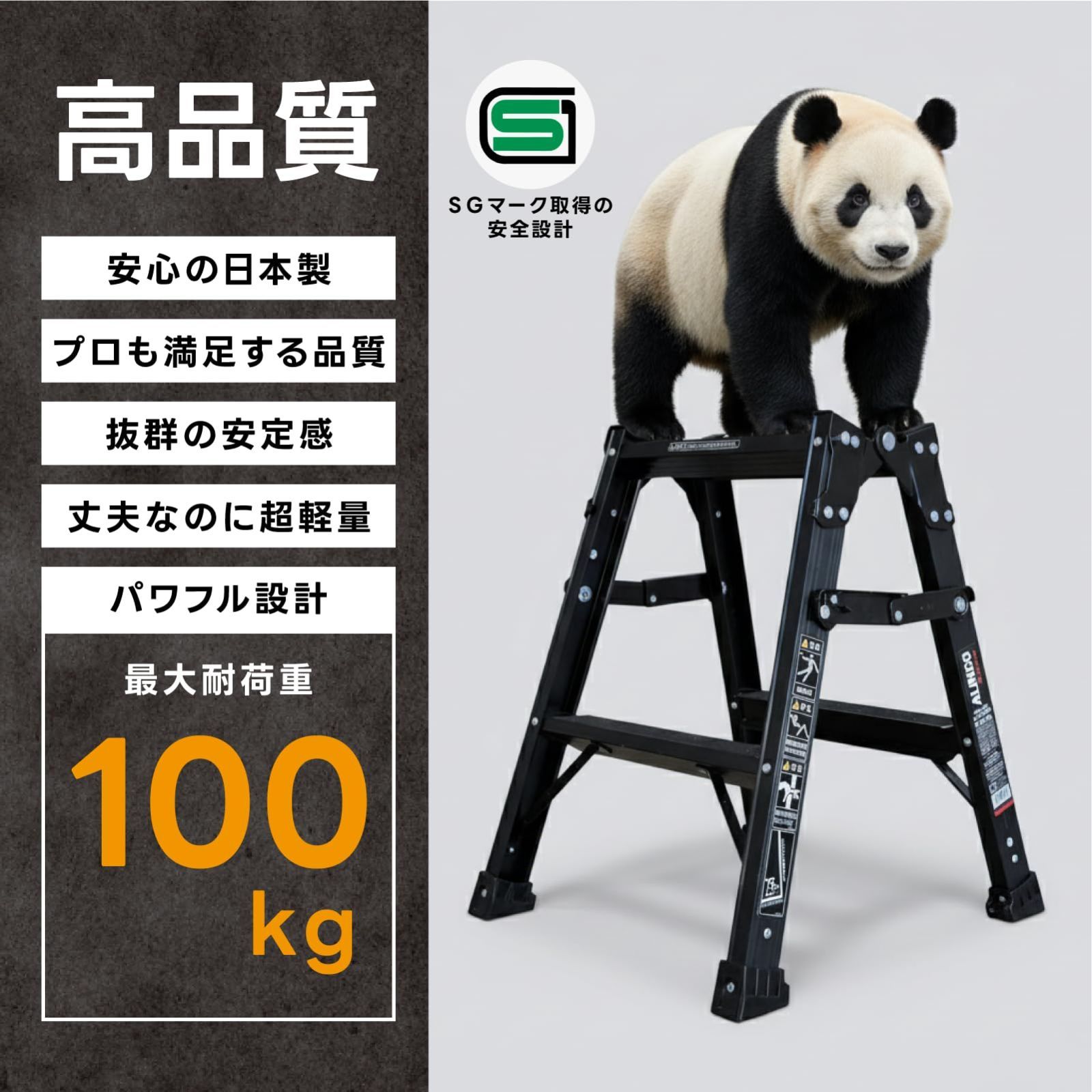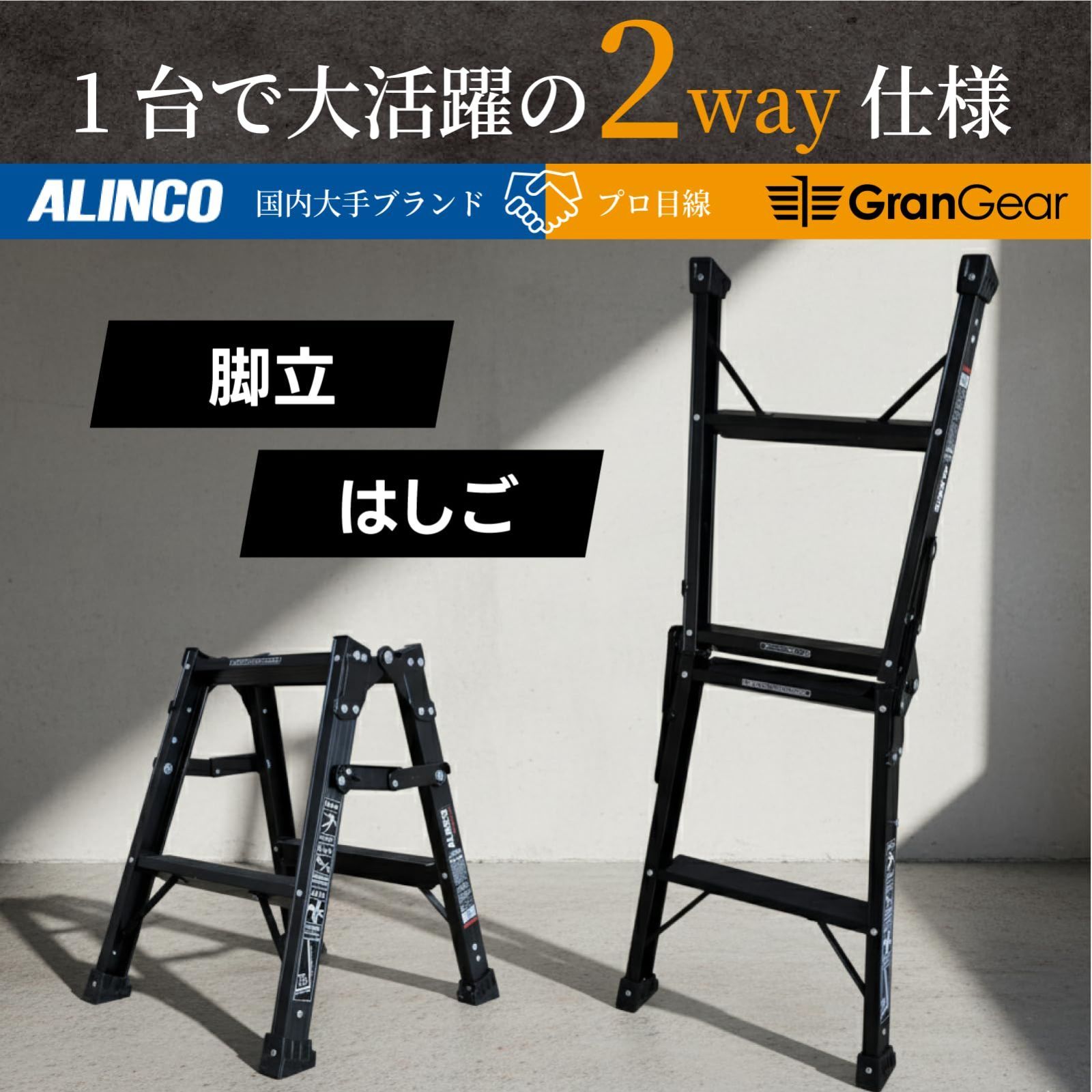 【信頼のメーカー品質】SGマーク取得済みの安全設計。しっかりした作りで長く 使える。 ブラックカラーの兼用脚立(はしごにも可変する)。プロの満足度を追求したブランド GranGear (グランギア) と ALINCO(アルインコ) とのコラボ商品。 各ステップにすべり止めテープ付。両面ワイドステップ55mm幅広踏ざん採用。耐久性と安全性が向上したはしご兼用脚立のスタンダードモデル。 ・