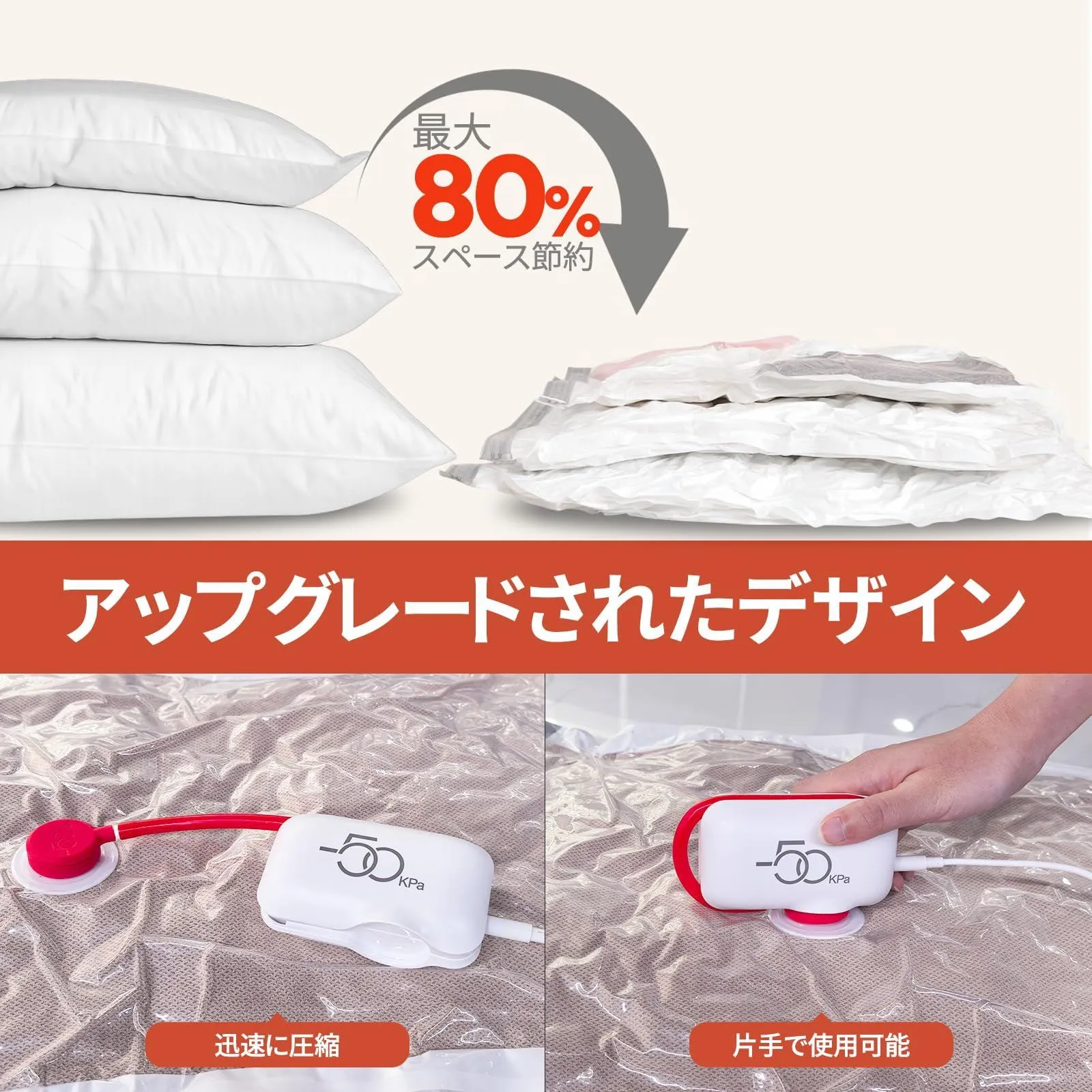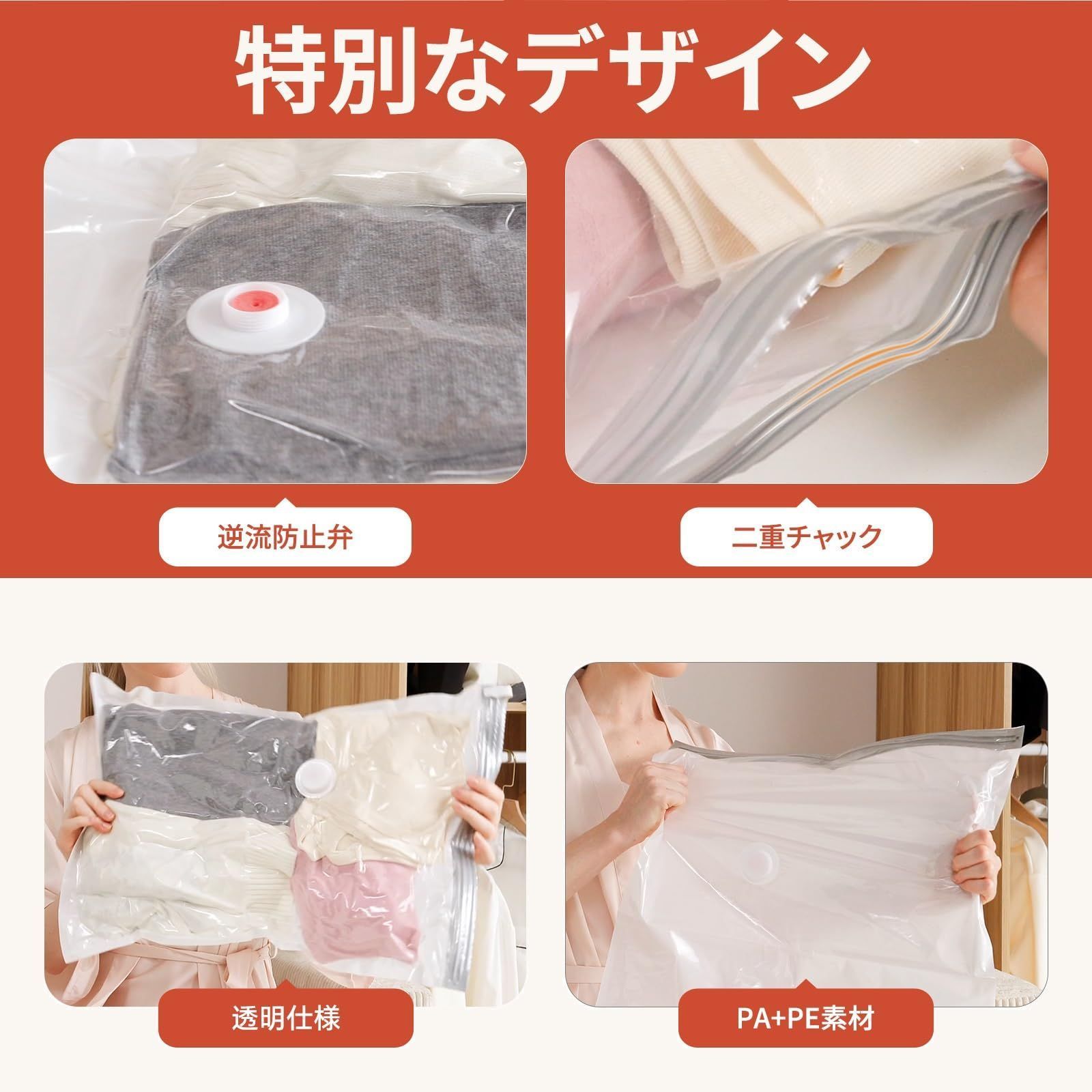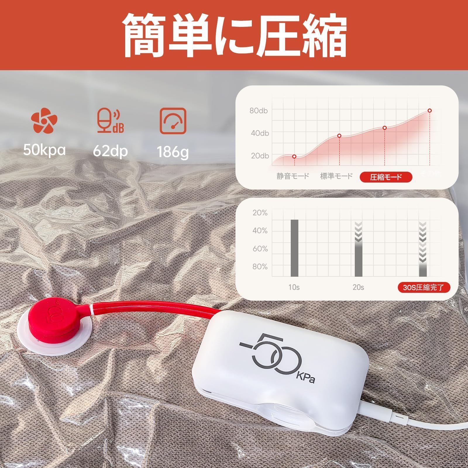 【超静音】運転音 <30db:パフォーマンスを損なうことなく、静かな衣類パッキング体験を提供します。家庭用掃除機の騒音を排除します、深夜に衣類を整理、掃除機不要にも最適です。